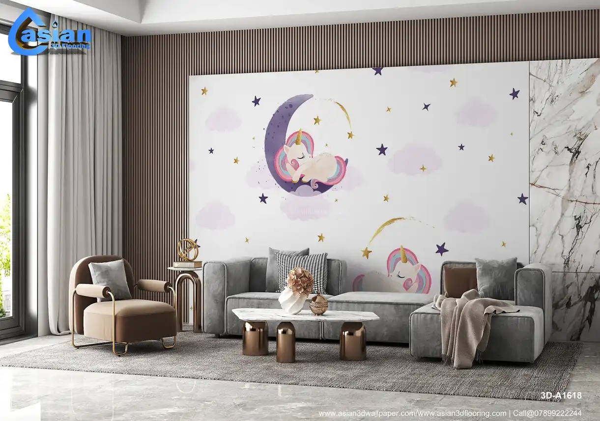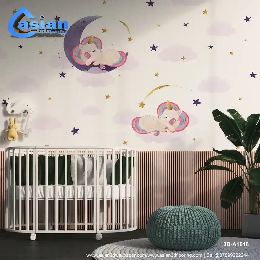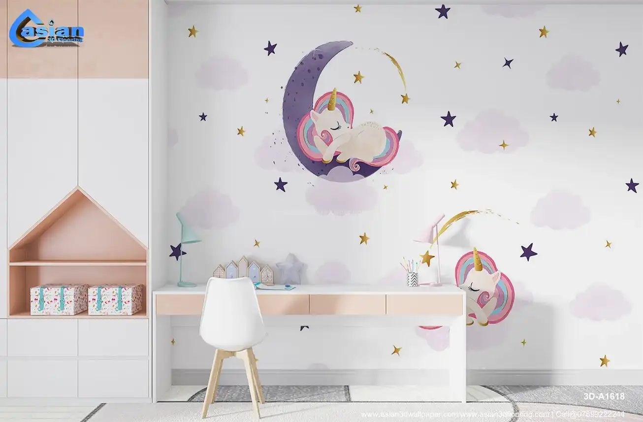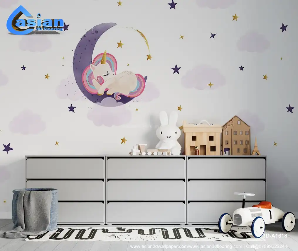 Create a dreamy space for your little one with this magical unicorn wallpaper. Featuring adorable unicorns peacefully sleeping on the moon and in the clouds, surrounded by golden and purple stars, this whimsical design adds a serene and enchanting atmosphere to any child's room. The soft pastel tones combined with sparkles create a magical and calm environment, perfect for bedtime or playtime. Benefits:- Adds a serene and dreamy atmosphere, perfect for creating a cozy and imaginative environment for kids. Ideal for bedrooms or nurseries, this wallpaper fosters creativity and sweet dreams with its soft hues and enchanting unicorn design.