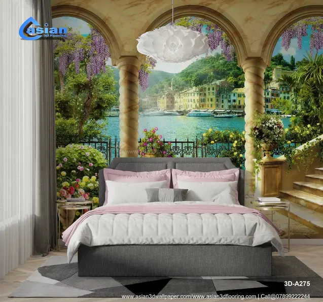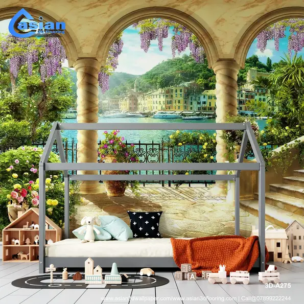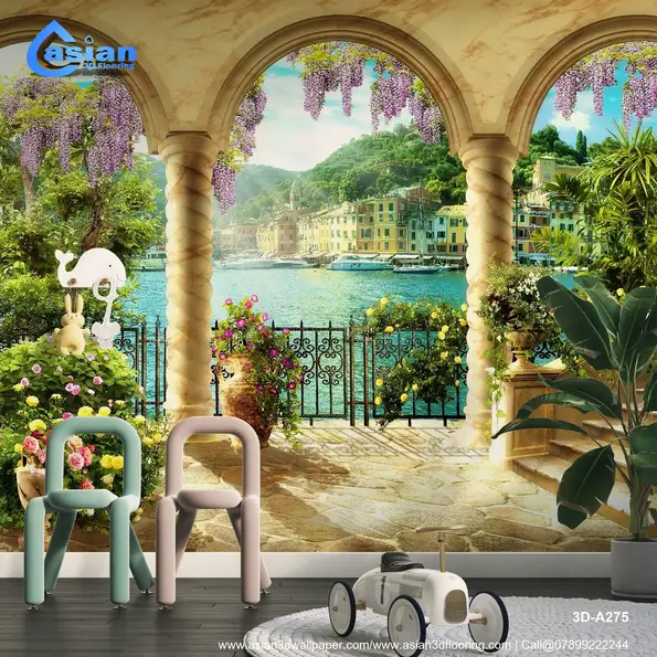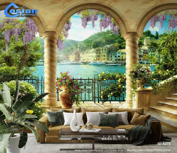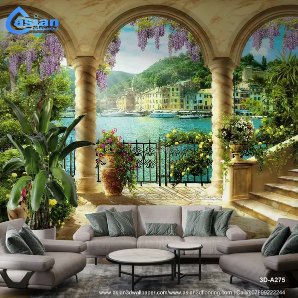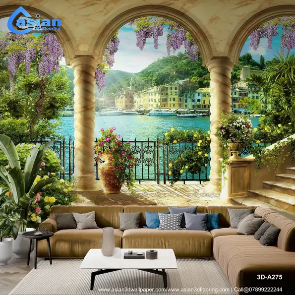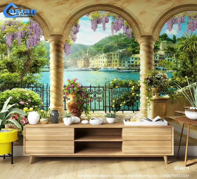 Transform your space with this stunning wallpaper showcasing a Mediterranean coastal view through a marble archway. This scene of vibrant flowers, clear blue water, and lush greenery brings a refreshing and peaceful vibe to any room. Product Benefits :- Perfect for living rooms or offices, it adds a serene, vacation-like atmosphere to your interior spaces.