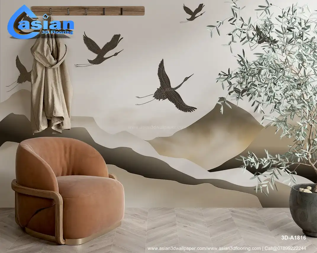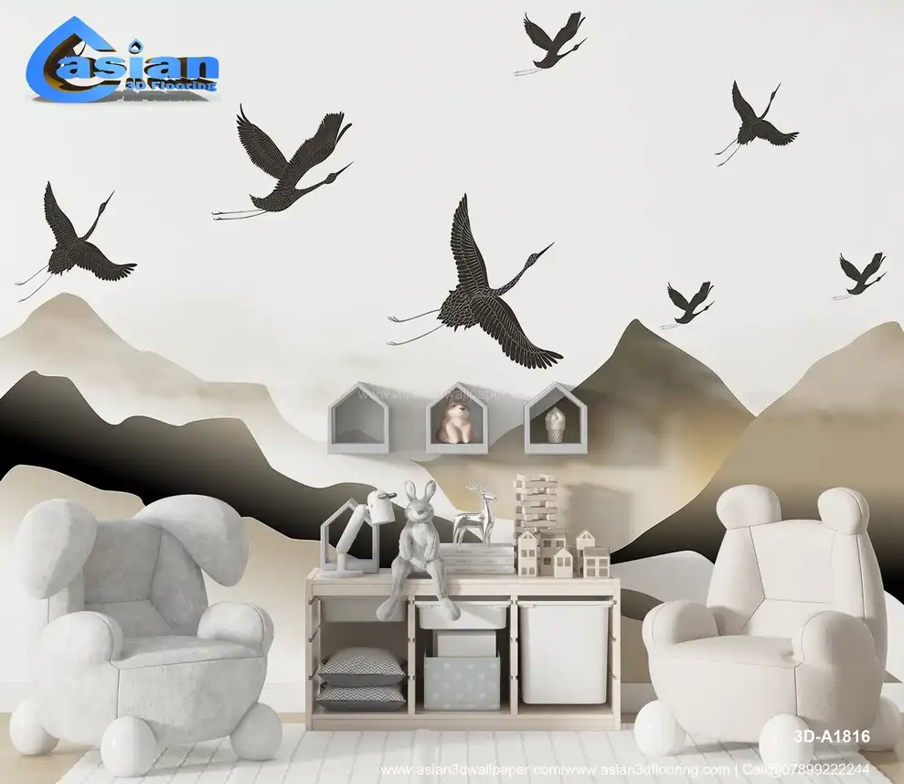 Minimalist Cranes and Misty Mountains Wallpaper||3D-A1816