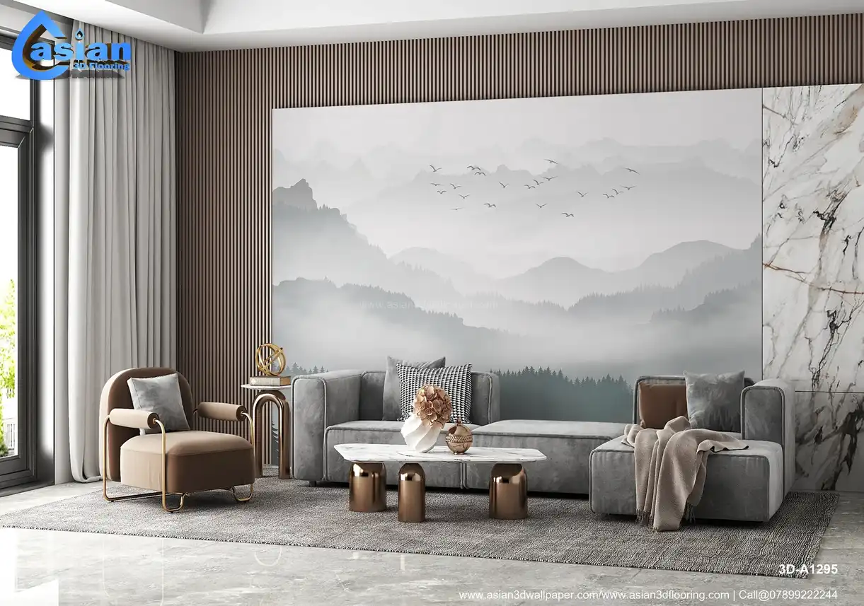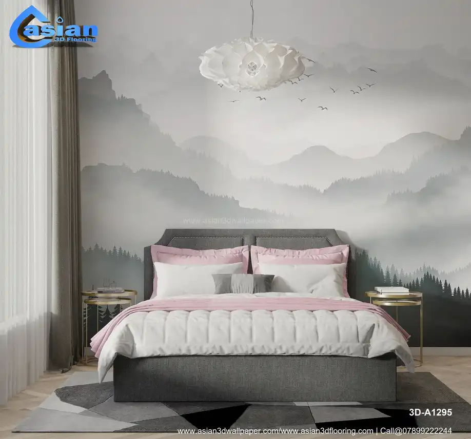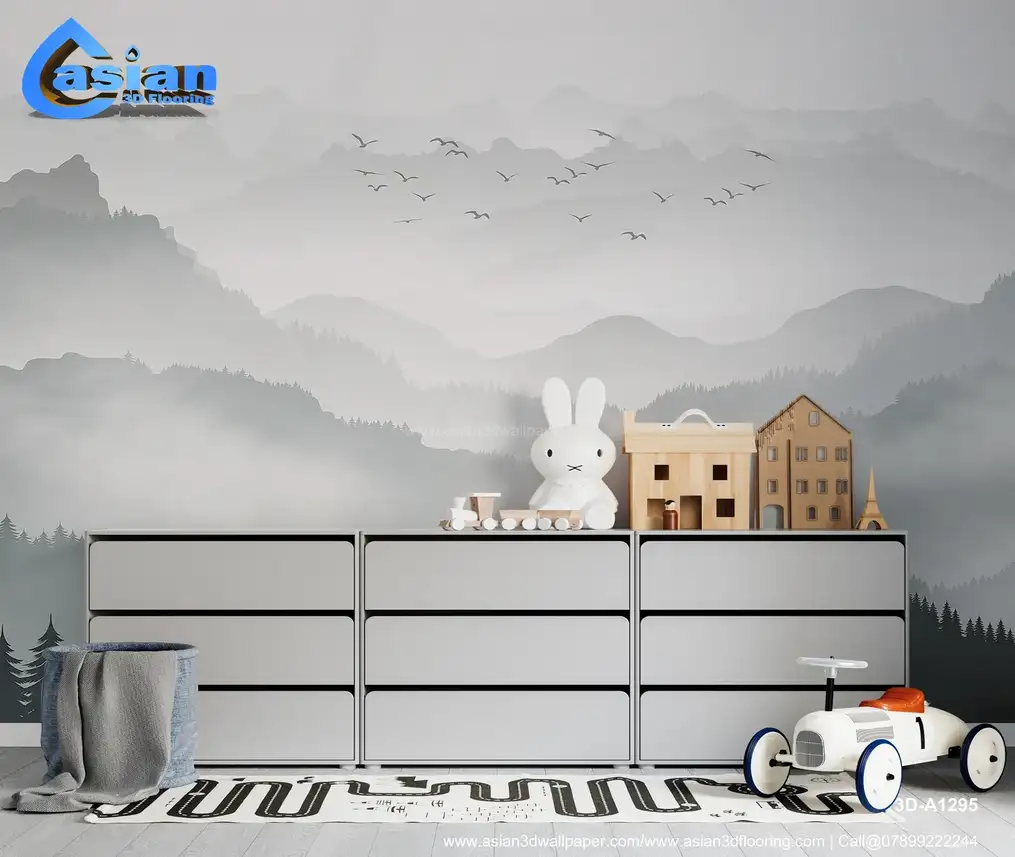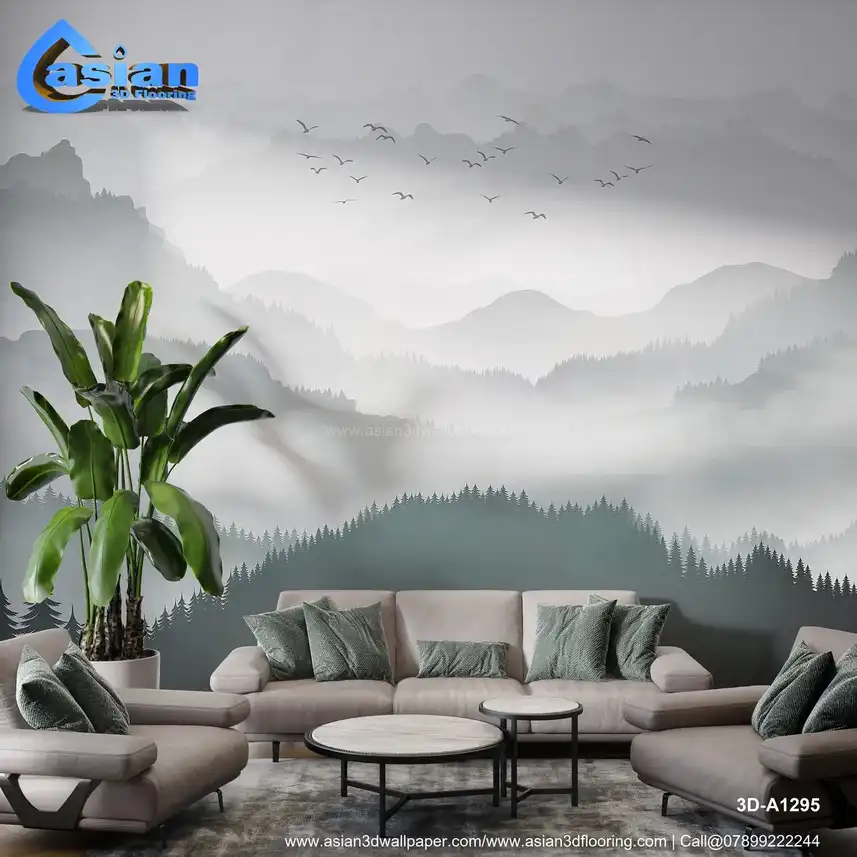 This serene wallpaper design features a soft misty mountain landscape, with layers of rolling hills fading into the distance. Evergreen trees create a peaceful foreground, while birds soar across the cloudy sky. The light gray and soft green tones evoke a sense of calm and tranquility, making this wallpaper perfect for creating a natural, peaceful atmosphere in bedrooms, living rooms, or study areas. The gentle blend of mountains and misty fog brings a peaceful escape into your space. Benefits:- Create a peaceful, tranquil space with this misty mountain landscape wallpaper, perfect for a relaxing atmosphere.