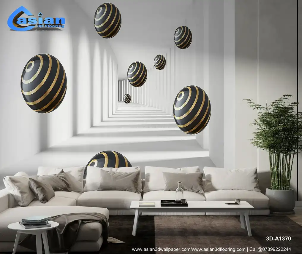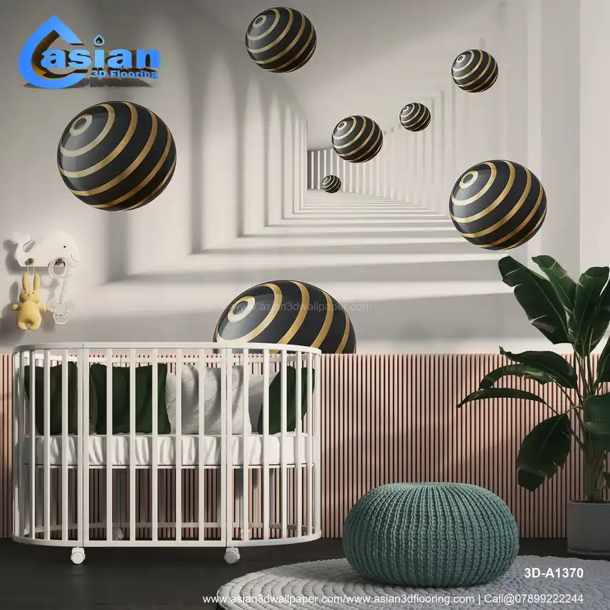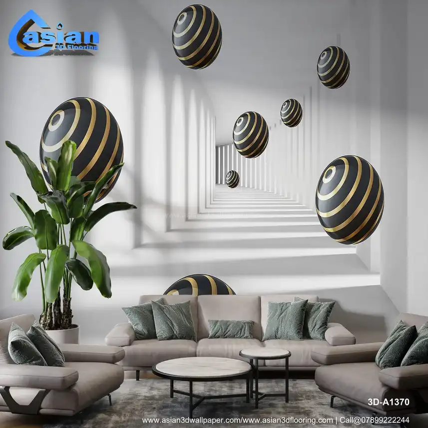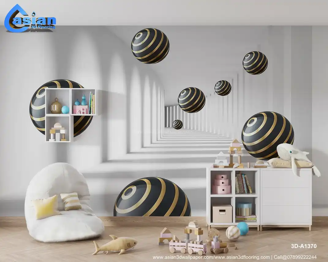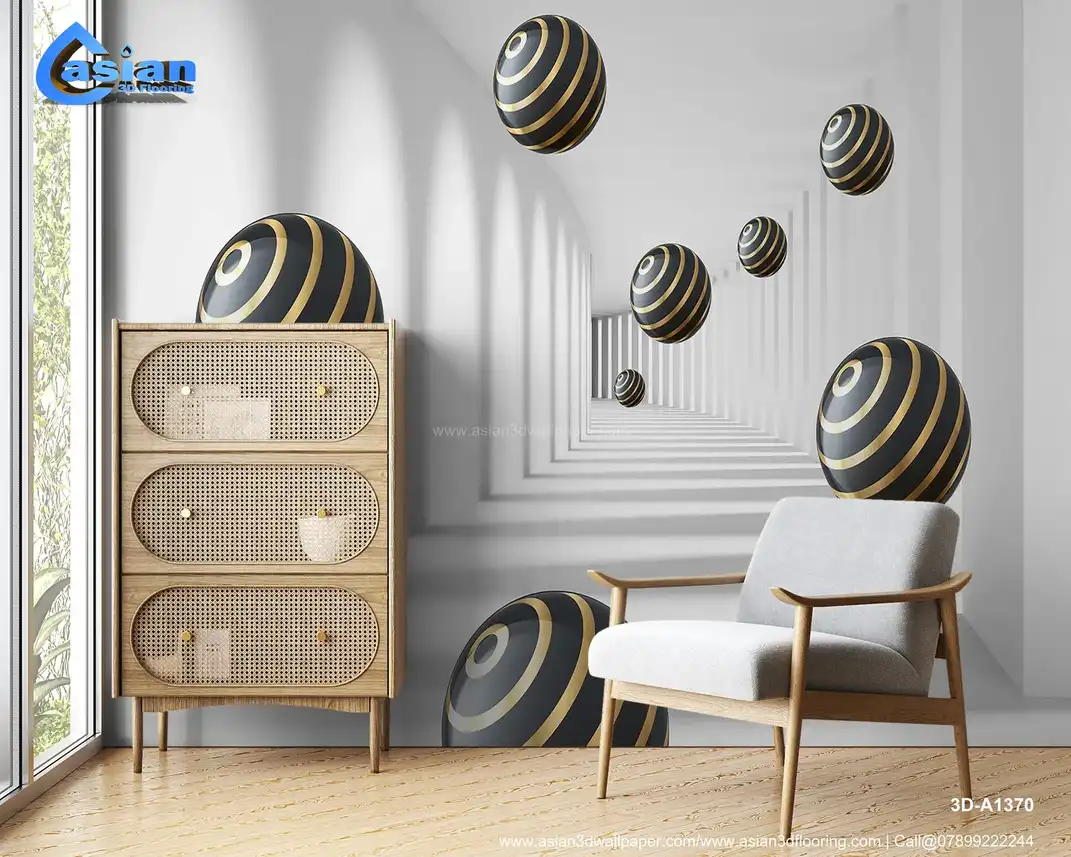 A visually striking wallpaper featuring floating black and gold striped spheres in a minimalist, geometric space, creating a bold and contemporary look. Benefits:- Adds a futuristic, stylish touch to any room, ideal for modern, minimalist interior designs.