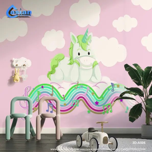 This playful unicorn wallpaper brings together the magic of unicorns and the joy of music! Featuring a cute green unicorn resting on a cloud with colorful musical notes, this design is perfect for creating a lively, imaginative space in children's rooms. The pastel pink background adds a soft, dreamy feel that makes it ideal for nurseries, playrooms, or bedrooms. Product Benefits :- Adds a playful and imaginative vibe to the room while stimulating creativity with its musical theme.