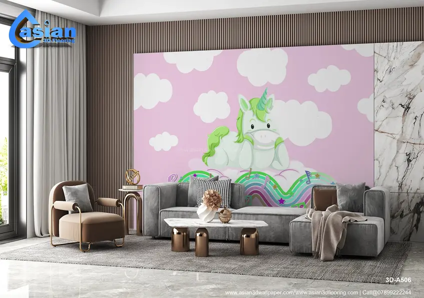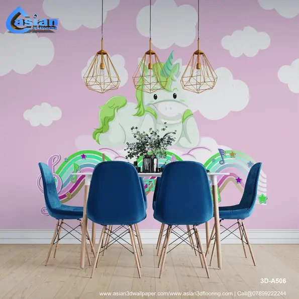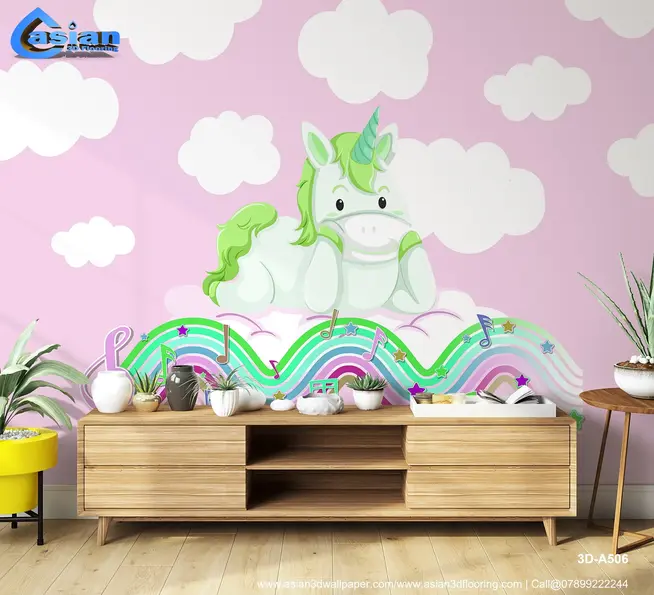Musical Unicorn Kids' Wallpaper in Pastel Green & Pink||3D - A506