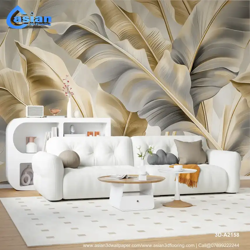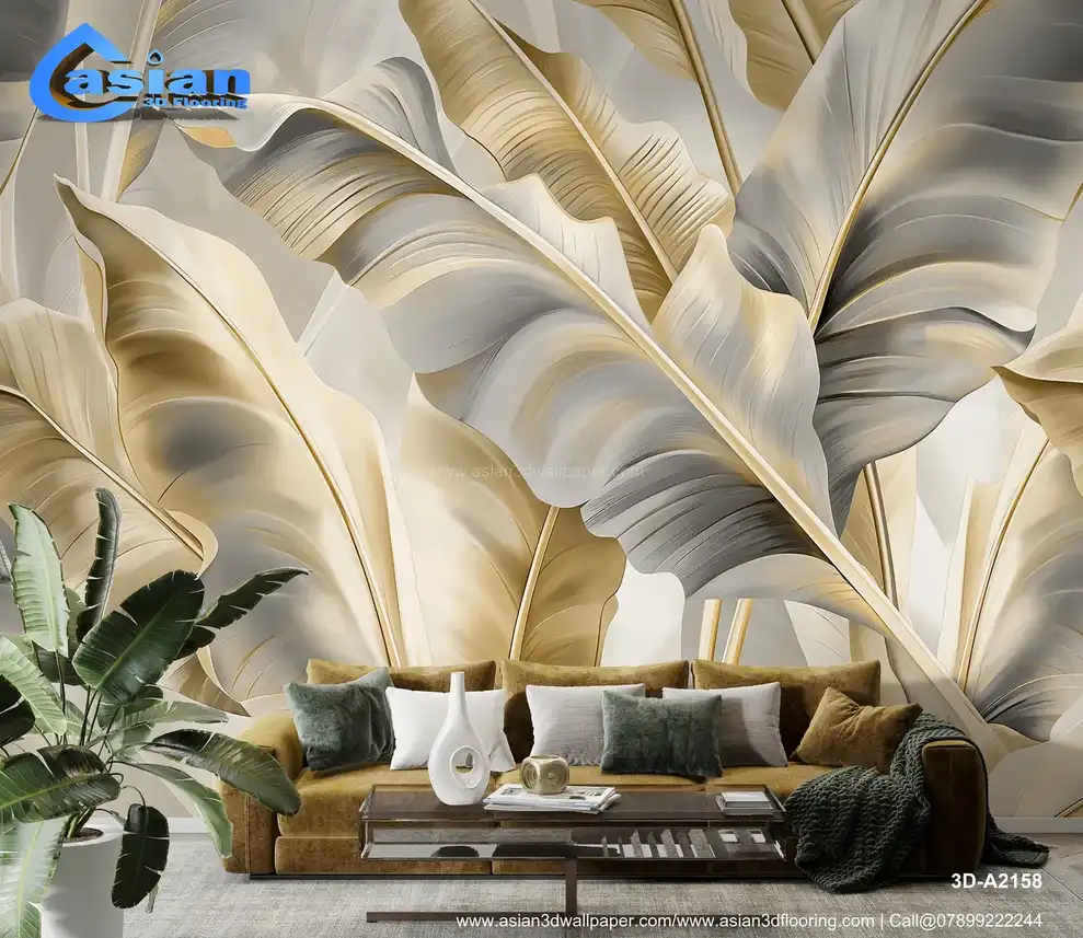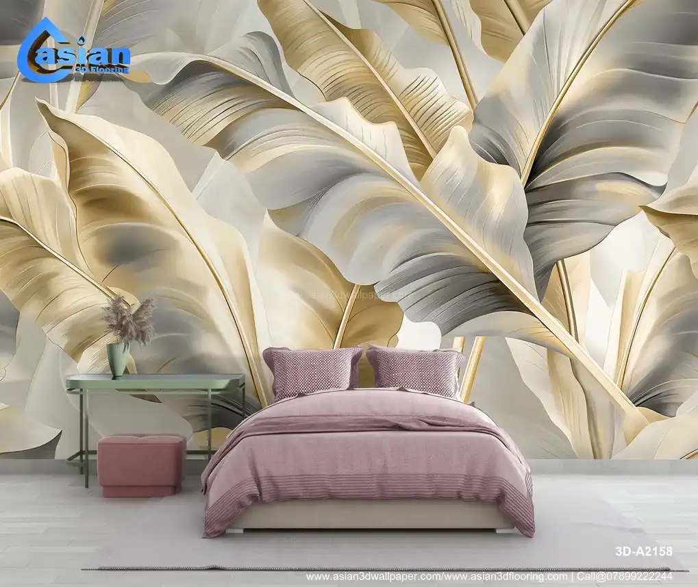 This image presents a close-up, stylized depiction of large, overlapping tropical leaves, likely banana or palm leaves, in a muted color palette of beige, gold/yellow, gray, and off-white. The leaves are depicted with a sense of depth and texture, with subtle shading and highlights. The composition is dense and dynamic, with the leaves overlapping and angled in various directions. The overall impression is modern, natural, and slightly abstract. The repeating nature of the pattern makes it suitable for seamless tiling as wallpaper, backgrounds, or fabric prints. Ideal for creating a calming and contemporary atmosphere in living rooms, bedrooms, studios, or as a stylish desktop or phone background. High-resolution image available for download. Benefits:- Creates a calming and contemporary atmosphere with a touch of natural elegance. The repeating pattern is ideal for seamless tiling. The muted colors and layered design are visually appealing and versatile. High-resolution image suitable for various applications. Free download available.