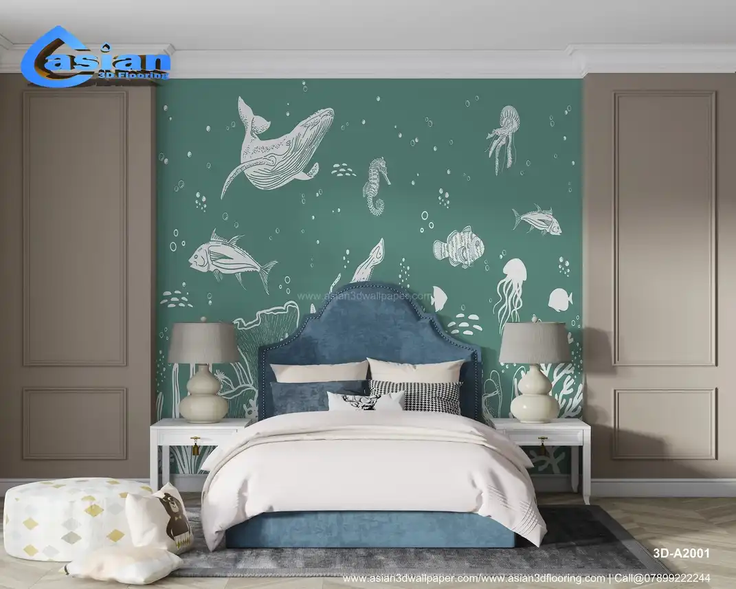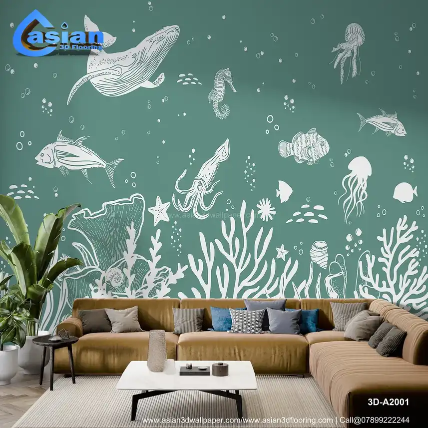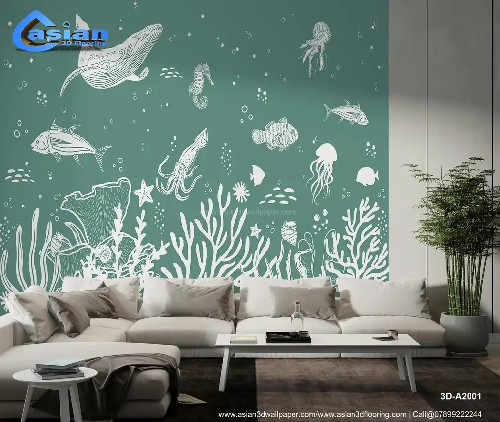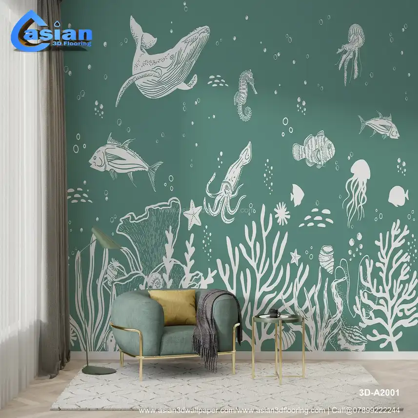 Ocean Life Wallpaper with Sea Creatures, Marine Life, and Coral Reefs (Green Background)||3D-A2001