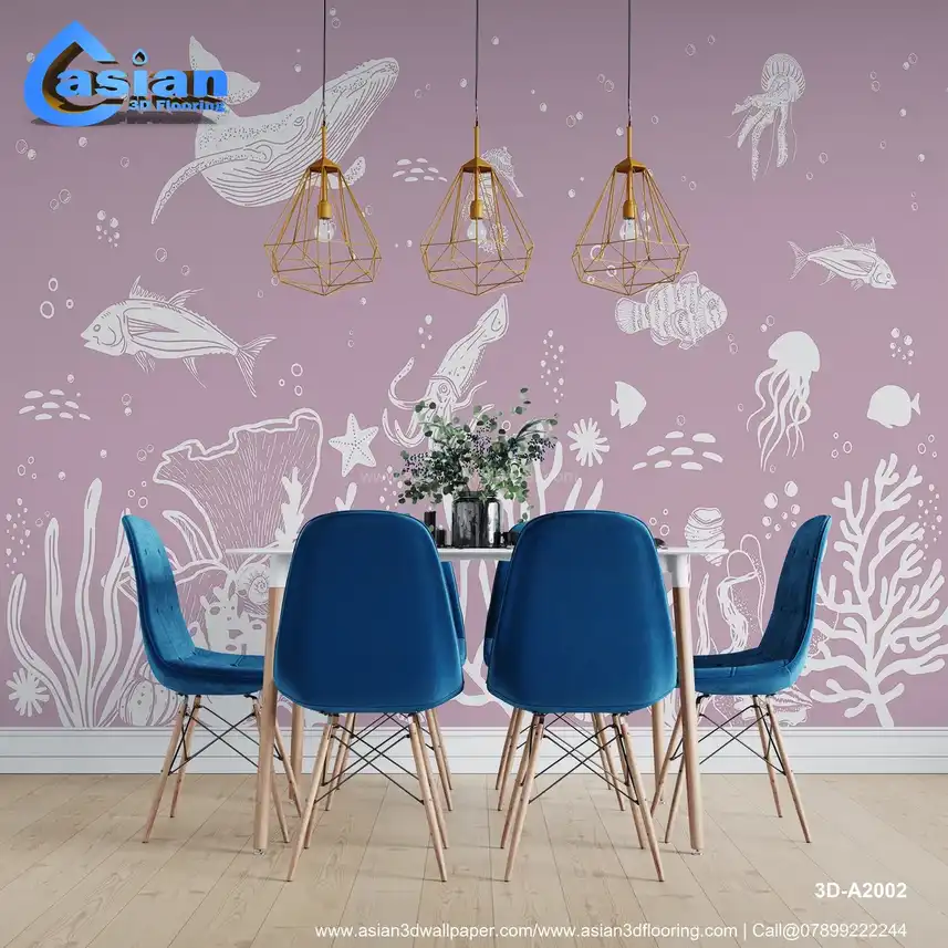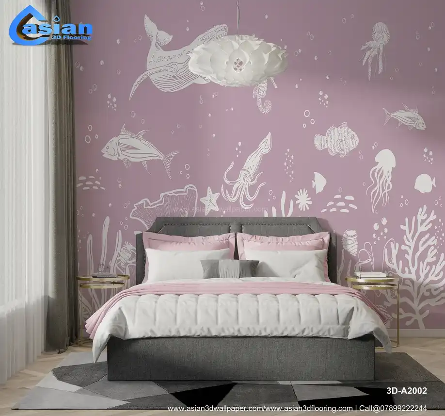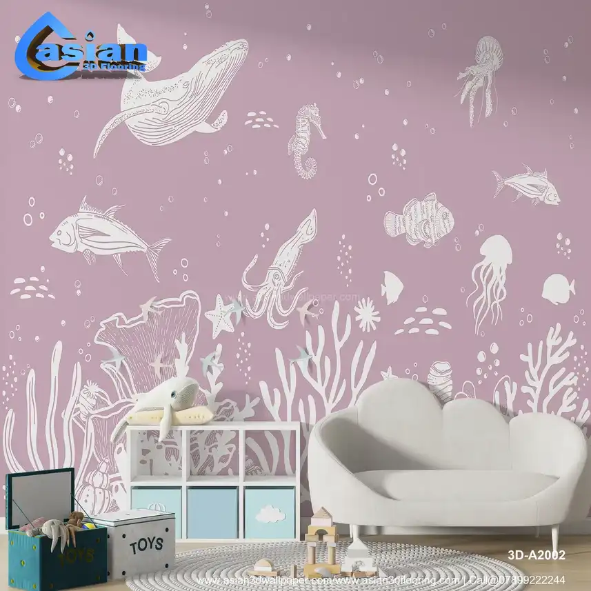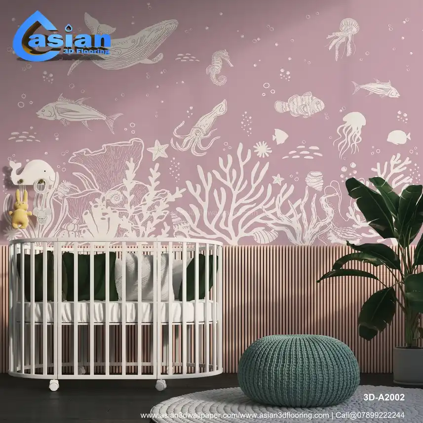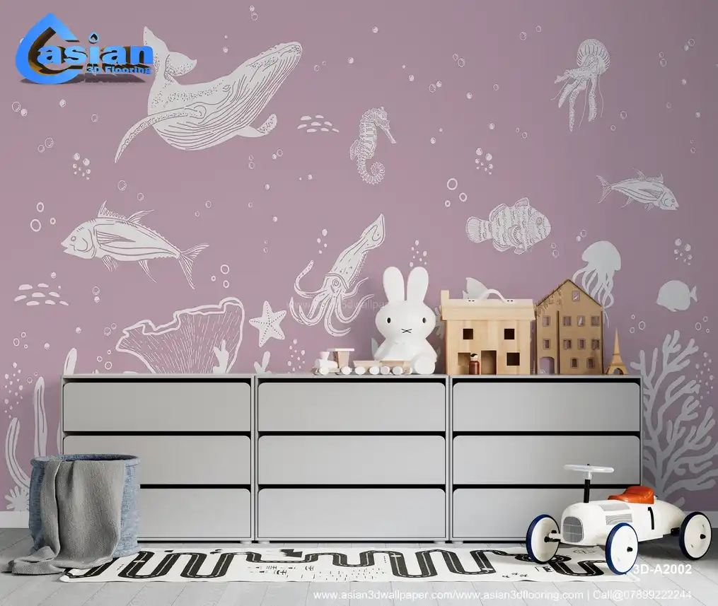 Ocean Life Wallpaper with Sea Creatures, Marine Life, and Coral Reefs (Pink Background)||3D-A2002