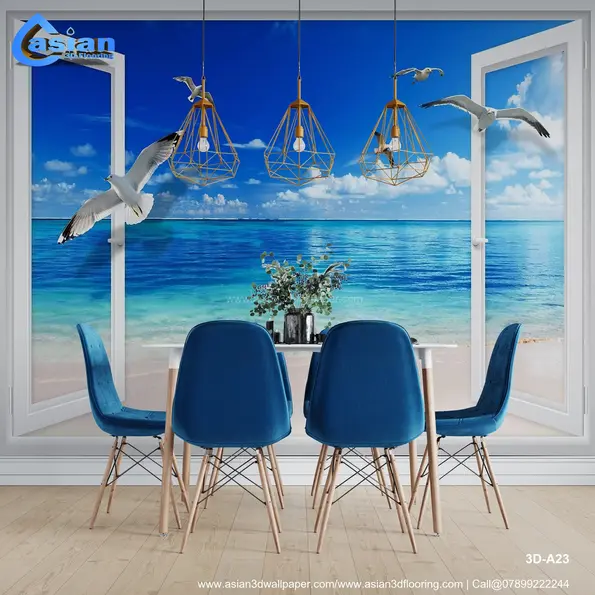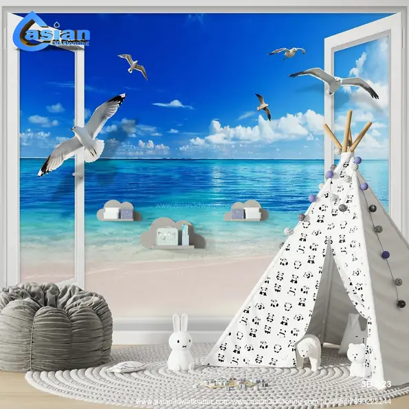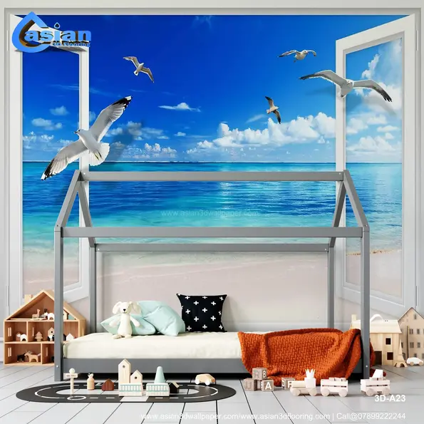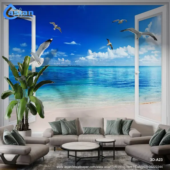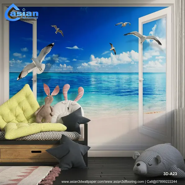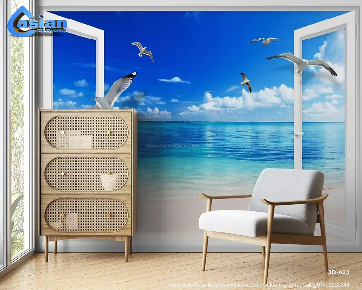 Transform your room into a coastal paradise with this stunning wallpaper featuring an open window view of a serene beach and crystal-clear ocean waters. The vivid blue sky, soft sandy shores, and gracefully flying seagulls create a relaxing and tranquil ambiance. Perfect for living rooms, bedrooms, or home offices, this wallpaper brings the beauty and calm of the sea into your interiors. Product Benefits :- Adds a relaxing coastal vibe to your interiors. Perfect for creating tranquil and serene spaces. Brings the beauty of the ocean indoors. Ideal for living rooms, bedrooms, or home offices.