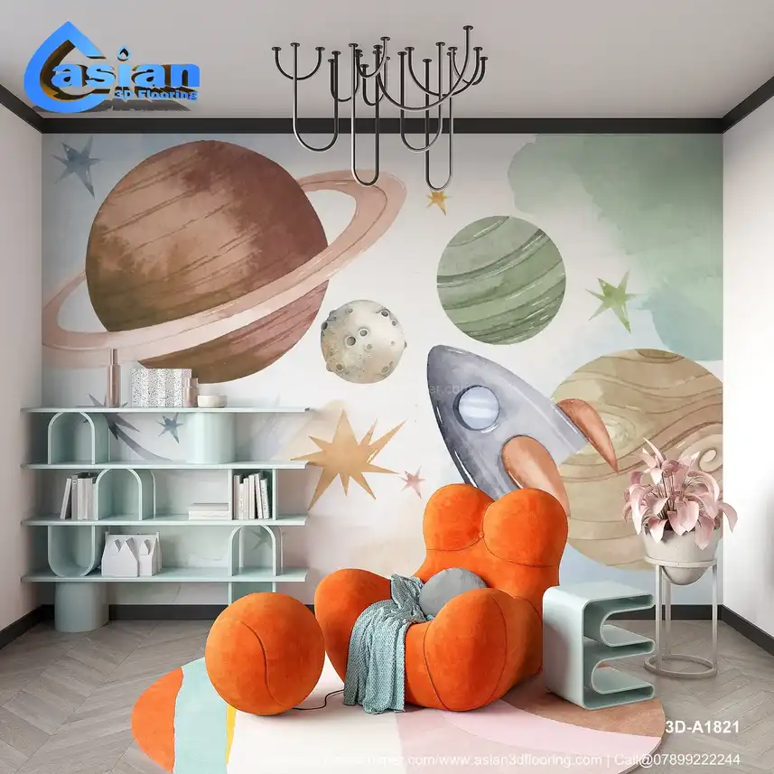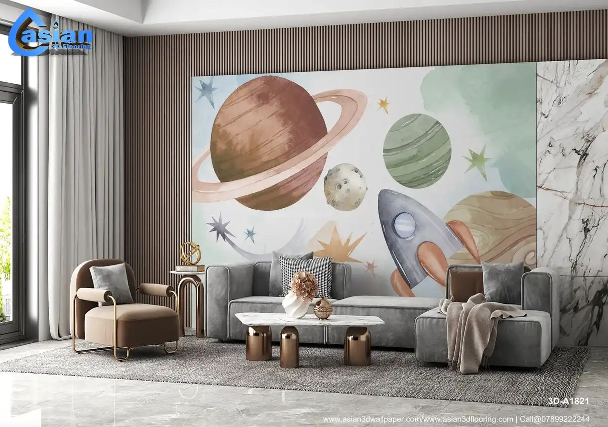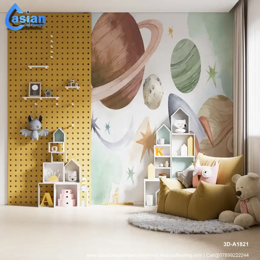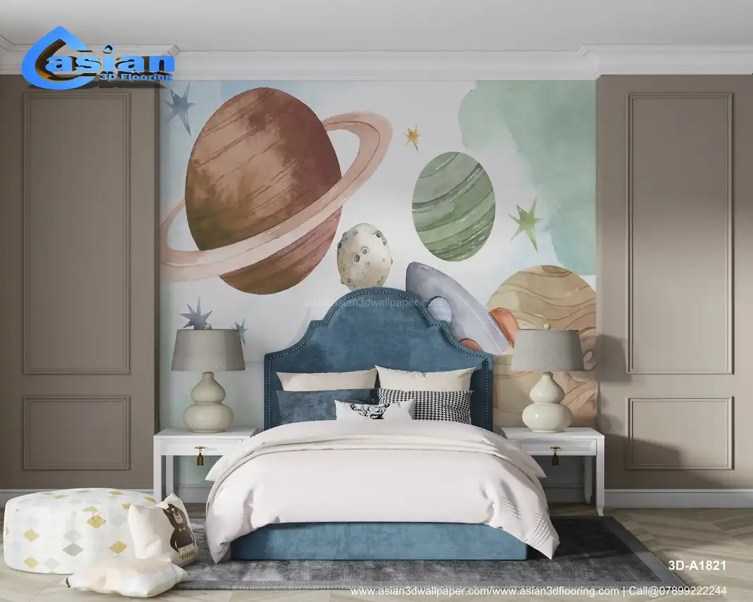 Transform your child?s room into a galactic playground with this outer space-themed wallpaper. Featuring hand-painted planets, stars, and a playful rocket, this design ignites imagination and curiosity about the universe. With soft watercolor tones in greens, browns, and pastels, it?s perfect for creating a calming yet stimulating environment for young space enthusiasts. Ideal for bedrooms, playrooms, or study areas, this wallpaper sparks creativity and makes learning about space fun. A unique, artistic addition that pairs well with modern and playful decor. Benefits:- Sparks imagination, encourages learning, adds a fun and educational decor element to kids' rooms