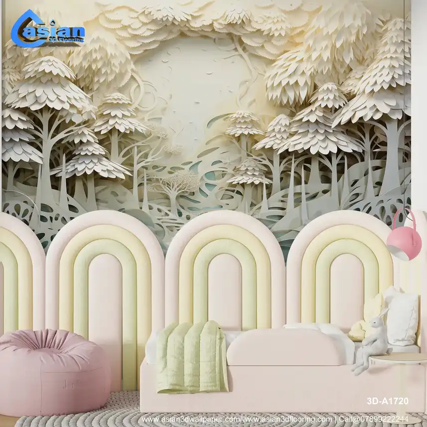 A serene paper-cut art depicting a forest with trees, a winding path, and intricate designs, all in soft beige and white tones. Benefits:- A peaceful paper-cut design featuring trees, a winding path, and nature-inspired artwork in soft hues.