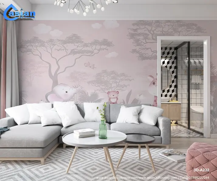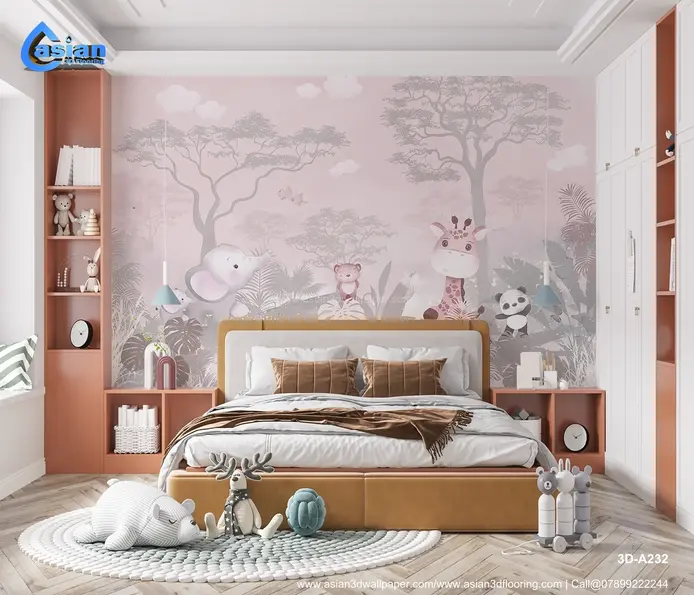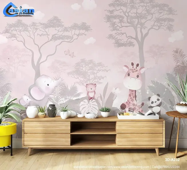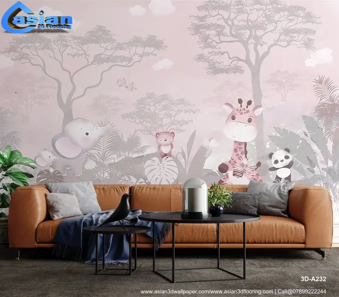 Pink Safari Friends 3D Wallpaper for Kids' Room||3D - A232