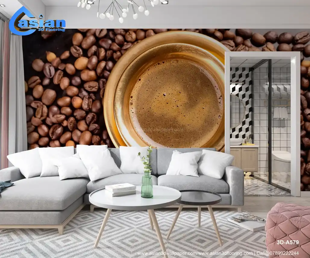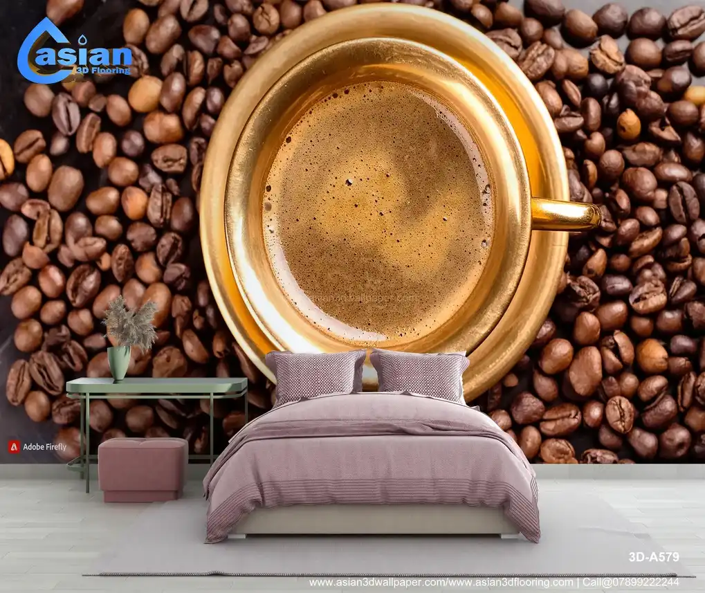 Rich Coffee Bean Wallpaper with Golden Espresso Cup||3D-A579