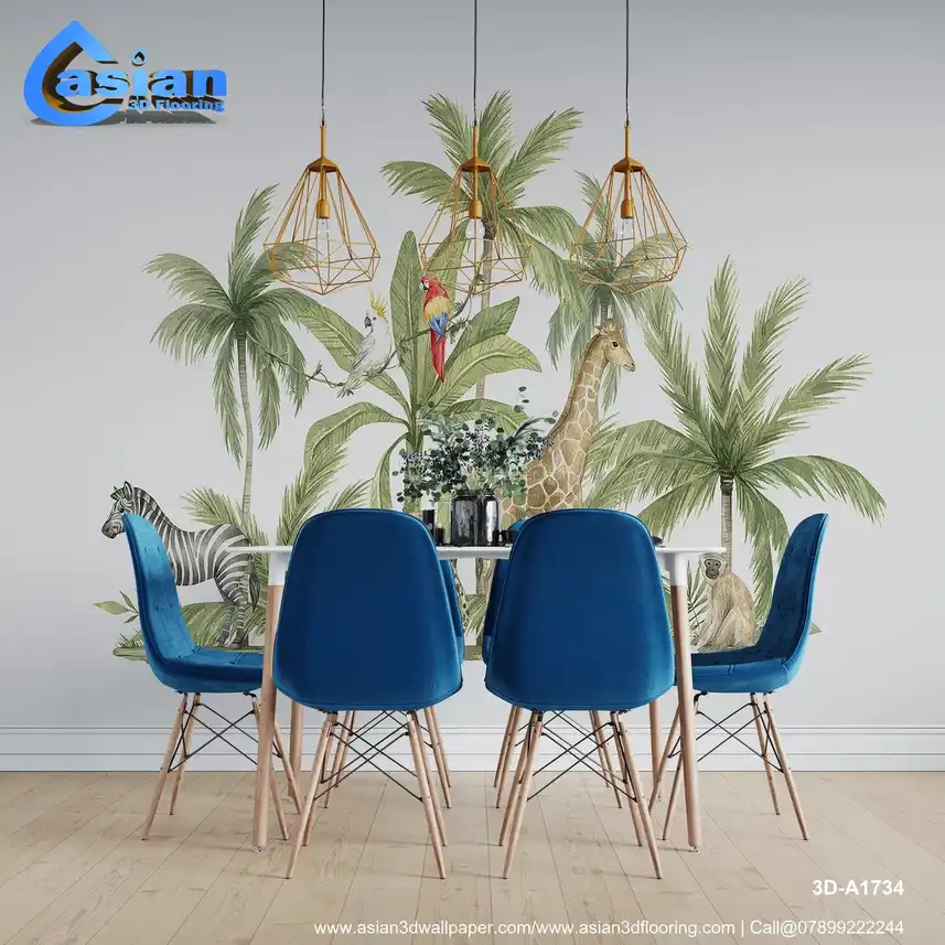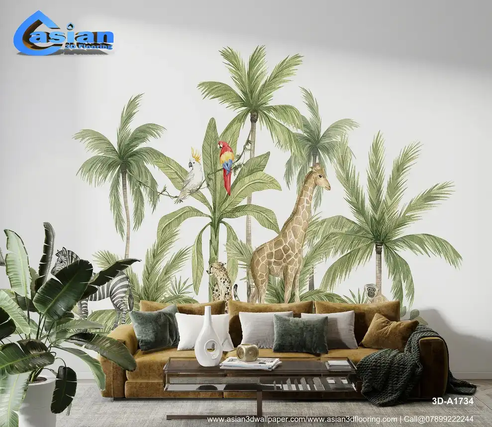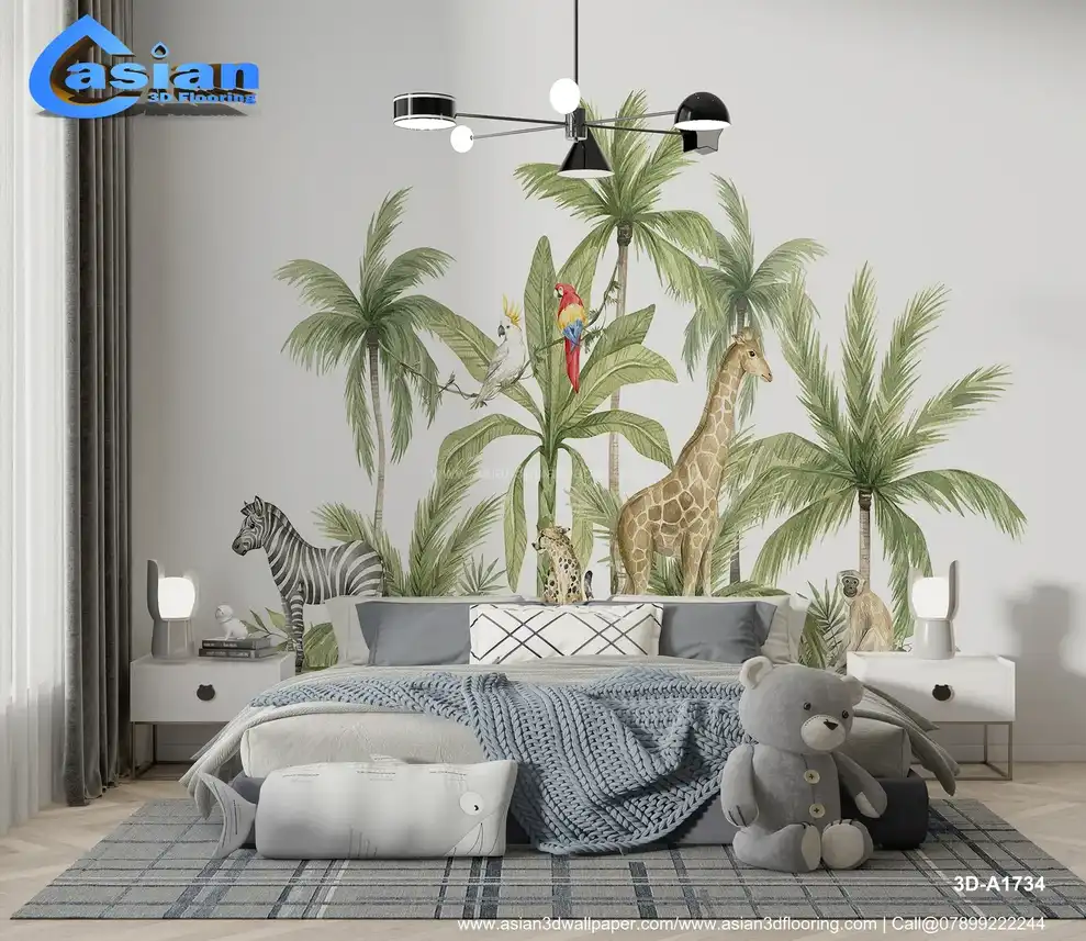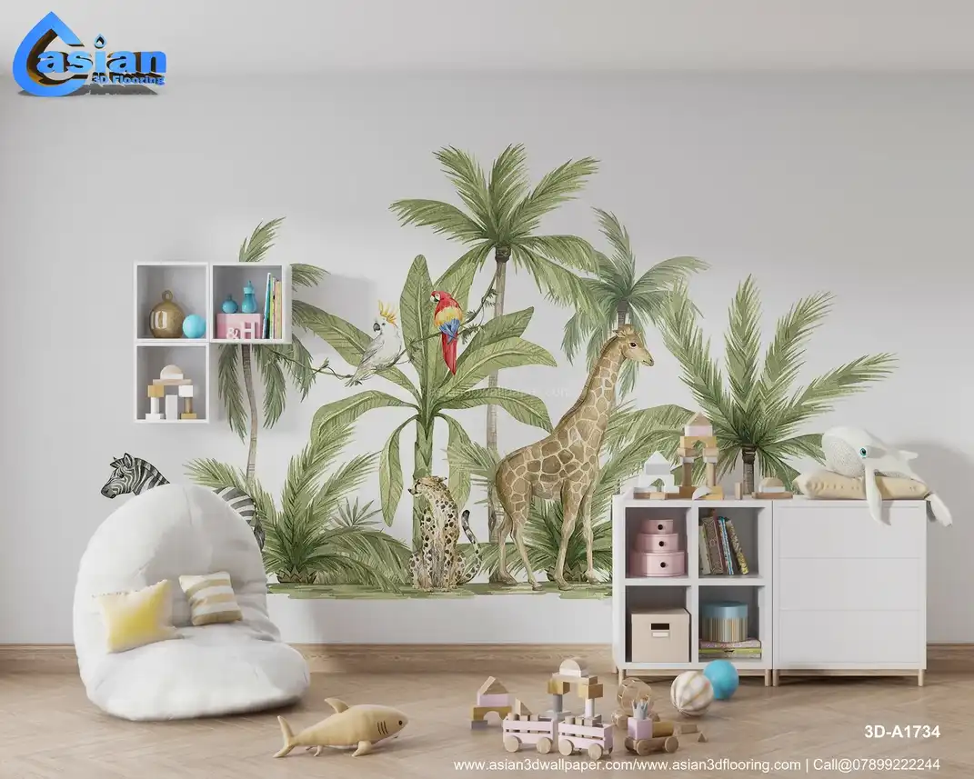 Bring a safari adventure to life with this vibrant wallpaper, featuring animals like giraffes, zebras, and tropical birds among lush greenery. This design is perfect for creating a fun and educational atmosphere in kids' spaces. Benefits:- Adds a playful and imaginative environment; eco-friendly materials, safe for kids' rooms; inspires creativity and a love for animals and nature