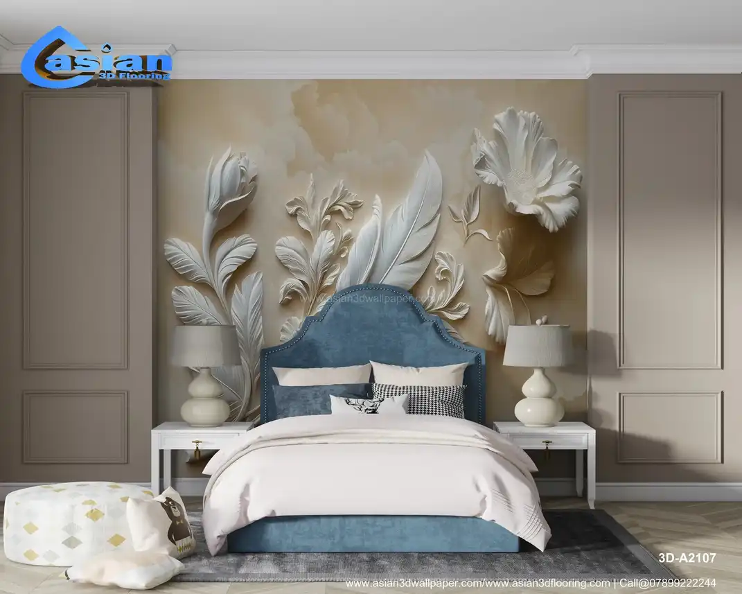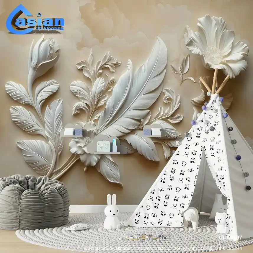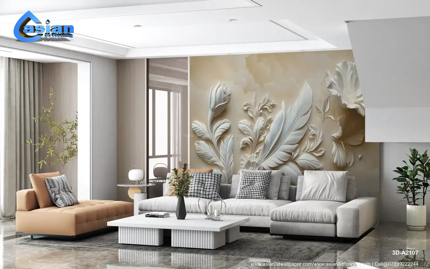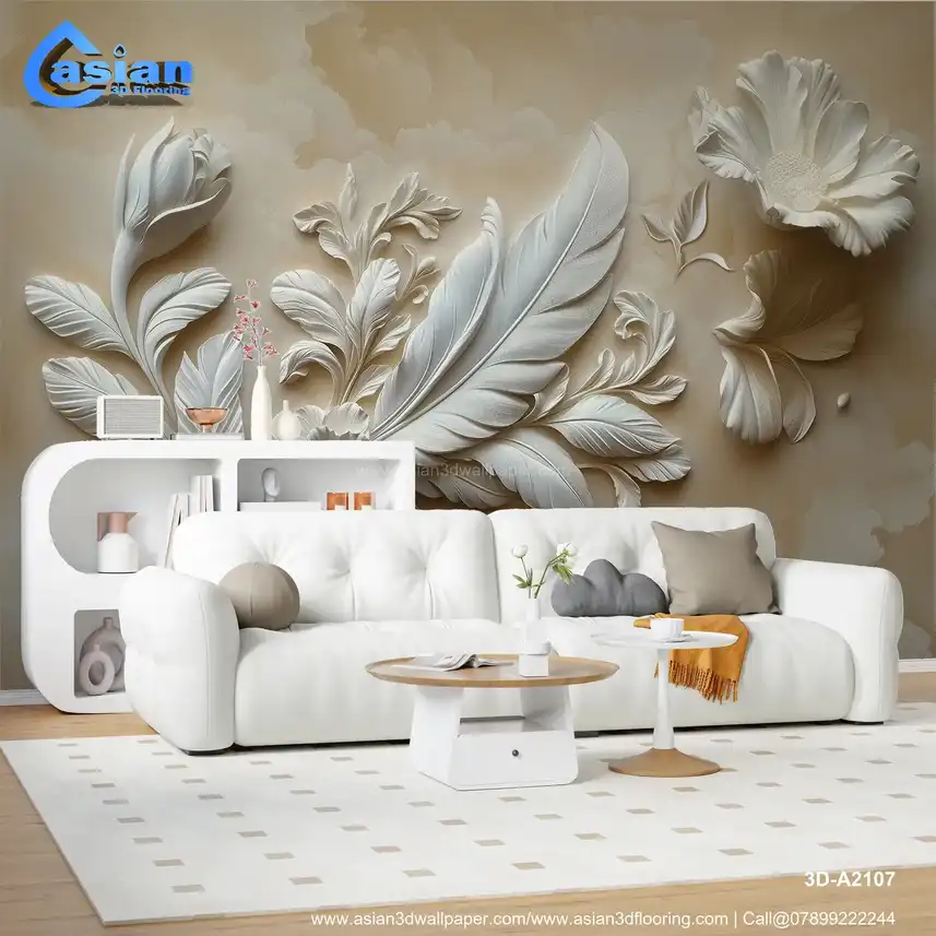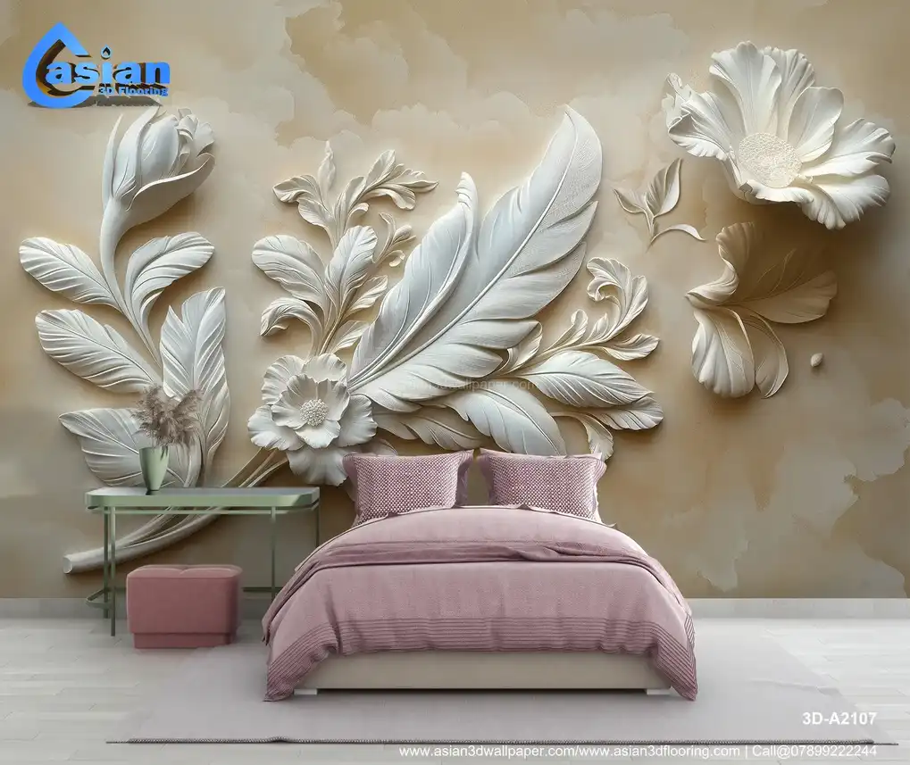 This elegant image showcases a sculpted or embossed floral design intended for wall decor. The design is predominantly white or off-white against a textured beige or light brown background, creating a striking three-dimensional, relief-like appearance. The elements include flowers, leaves, and stylized feathers, arranged in a balanced and somewhat classical composition. The effect resembles plasterwork, bas-relief, or similar sculptural techniques. Ideal for adding a touch of sophisticated elegance and artistic flair to living rooms, bedrooms, dining rooms, hallways, or other interior spaces. High-resolution image available for download. Benefits:- Creates a sophisticated and artistic focal point in any interior space. The three-dimensional effect and elegant design add depth and visual interest. High-resolution image suitable for various applications. Free download available.