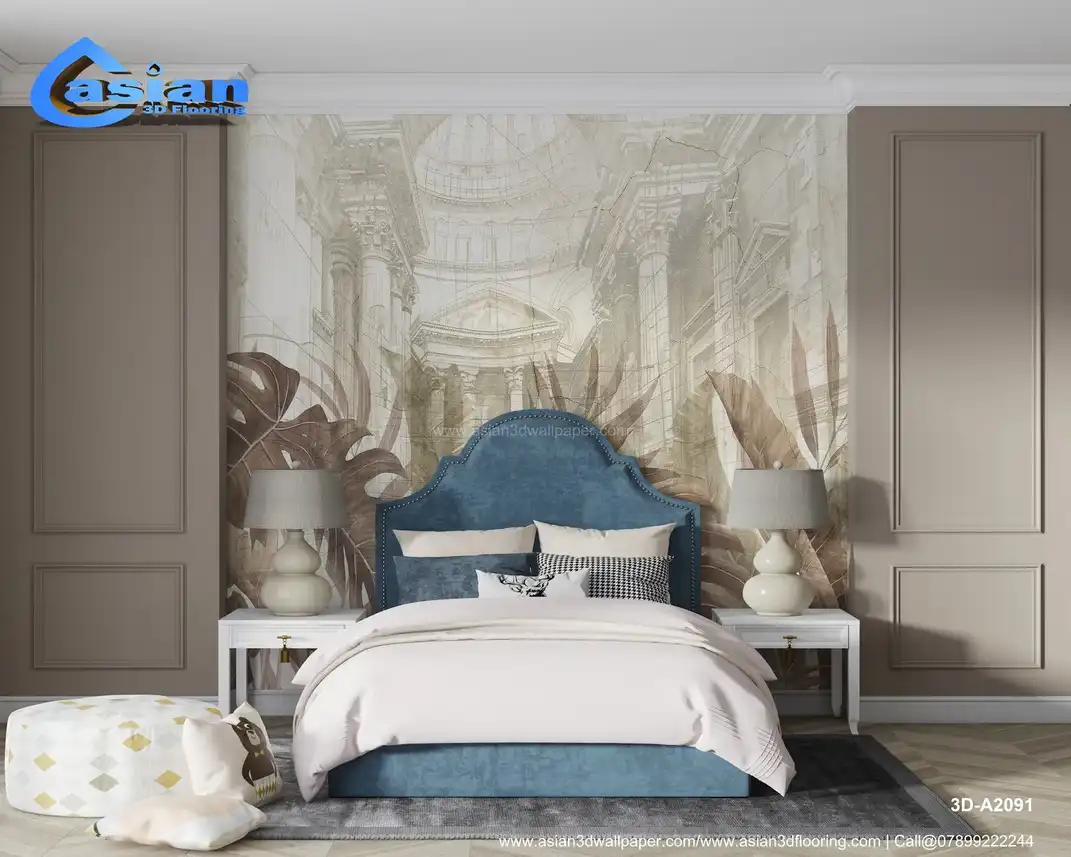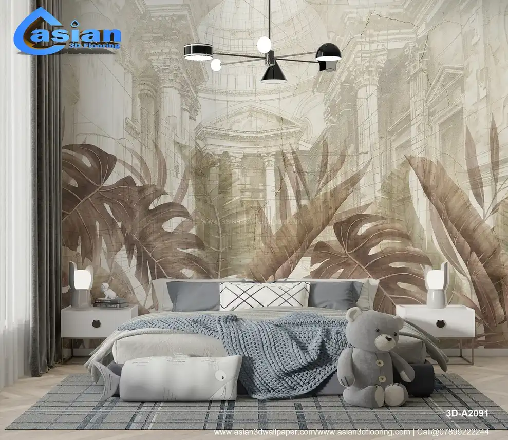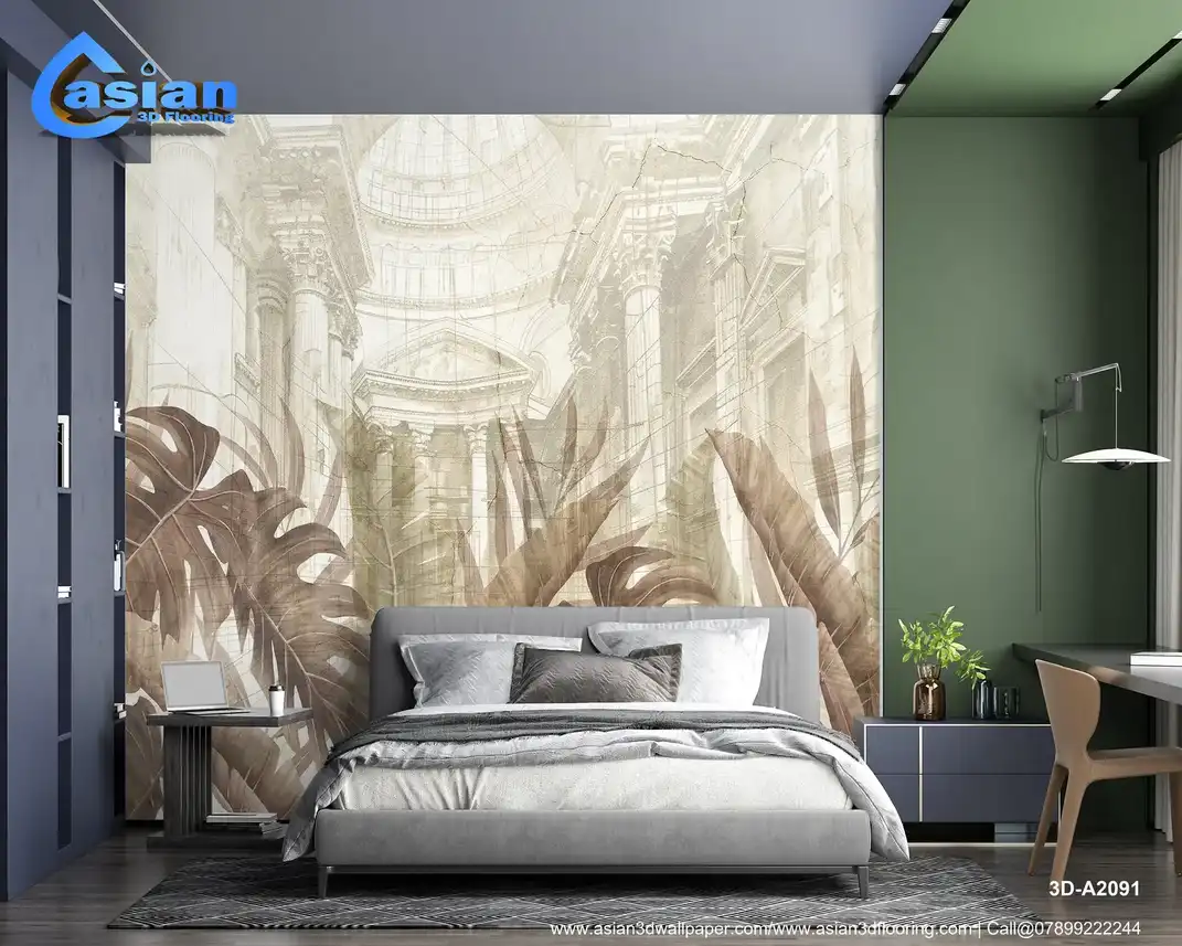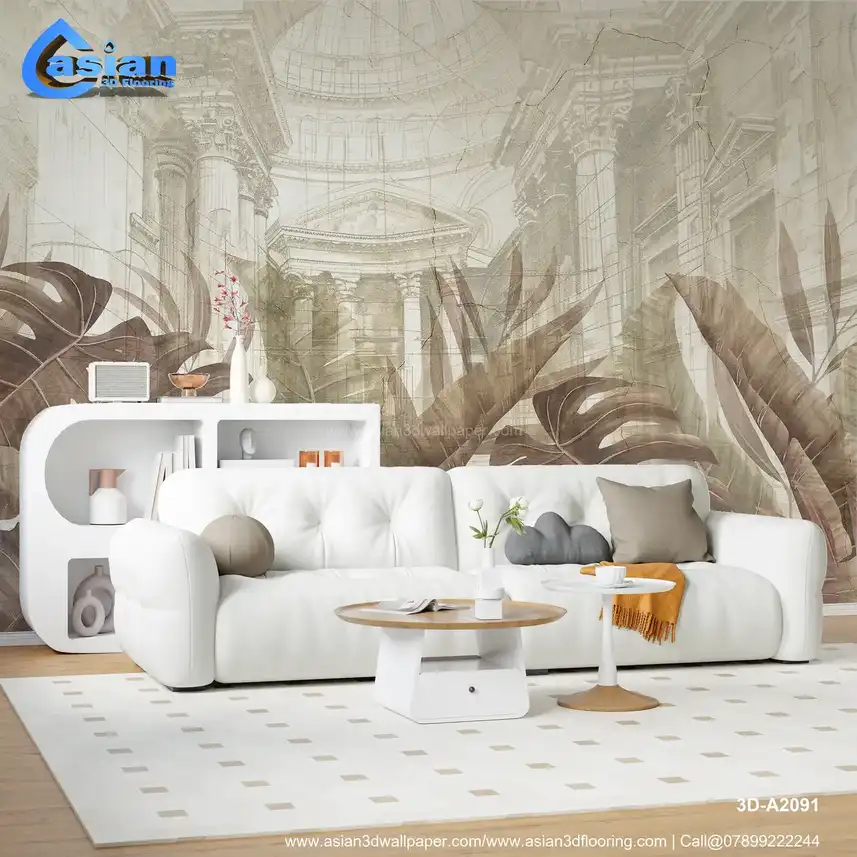 Sepia Tropical Leaves & Classical Architecture - Vintage Botanical & Urban Wallpaper||3D-A2091