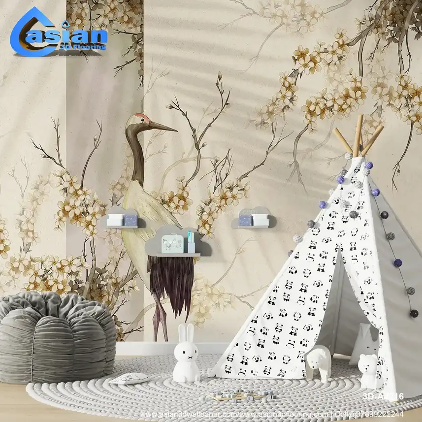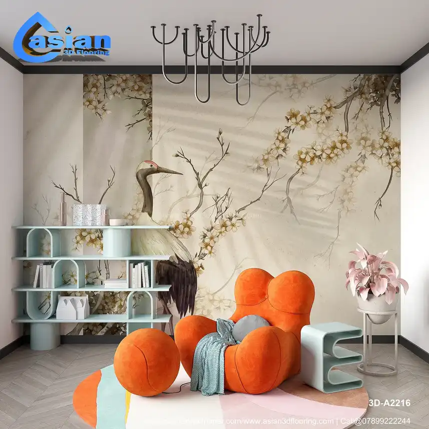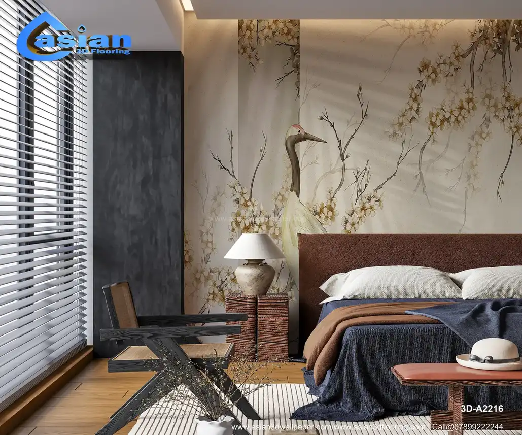 Serene Crane & Blossoms: Japanese-Inspired Wall Mural with Red-Crowned Crane||3D-A2216