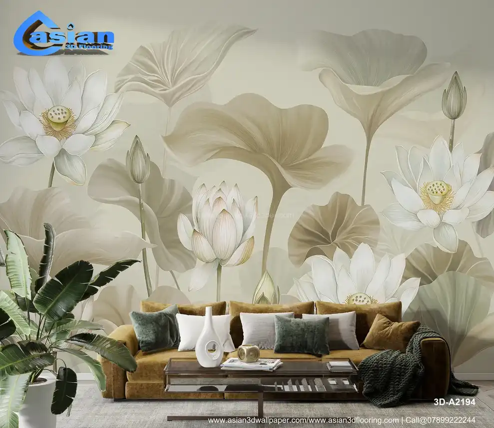 Serene Lotus Bloom: Elegant Wall Mural with Soft Floral Design||3D-A2194