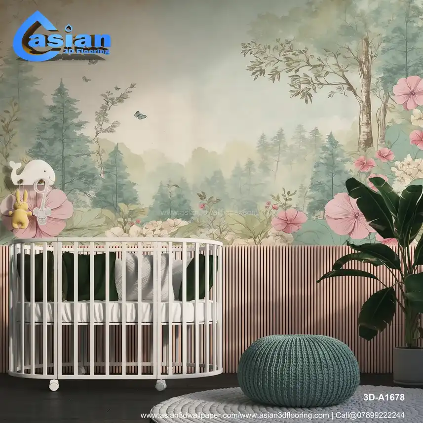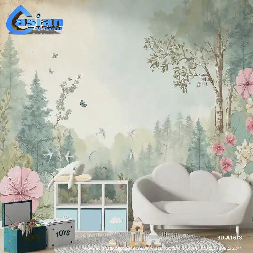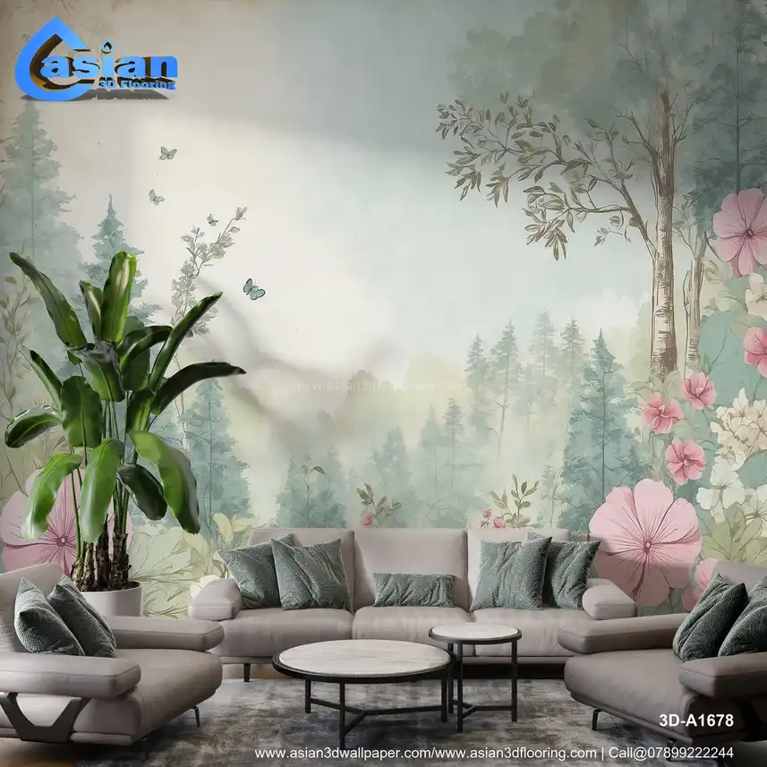 A tranquil watercolor floral wallpaper featuring soft blooms, delicate butterflies, and a lush forest background, perfect for creating a peaceful and elegant atmosphere in your home. Benefits:- Adds a calming, nature-inspired touch to any room, with soft pastel tones and delicate details. Perfect for creating a peaceful space.