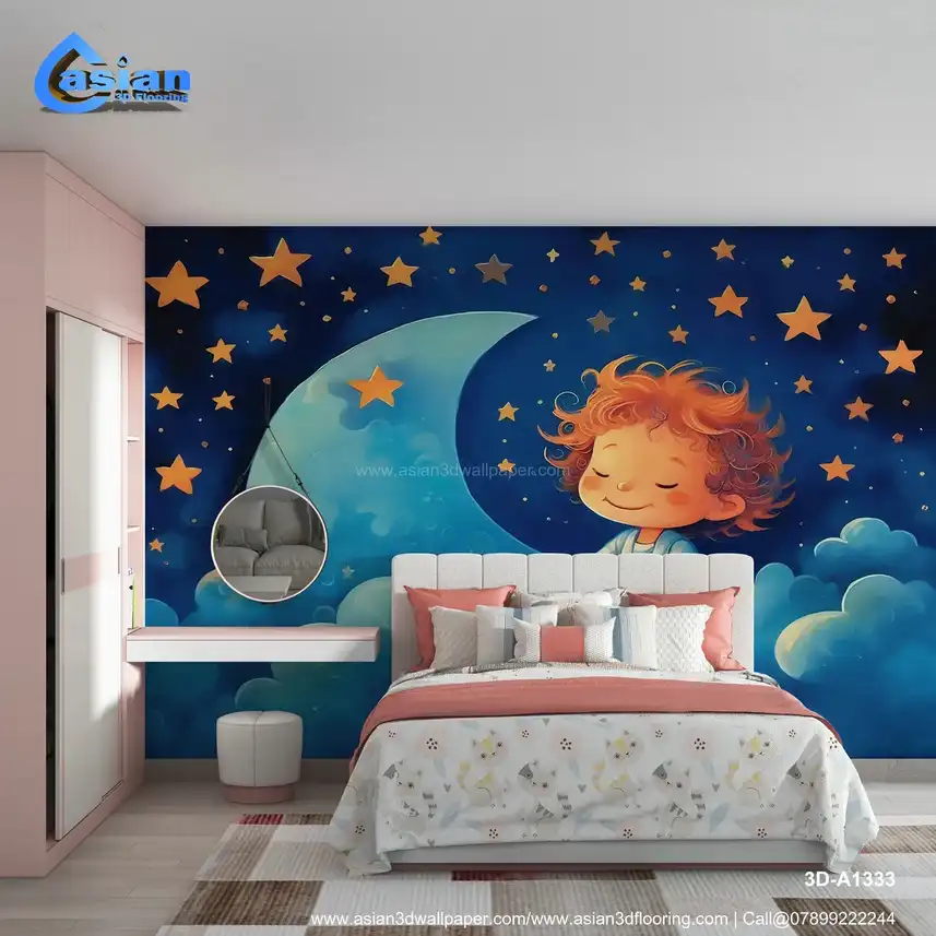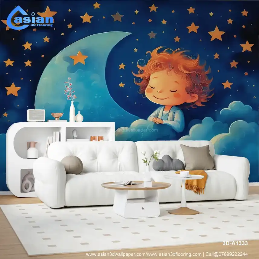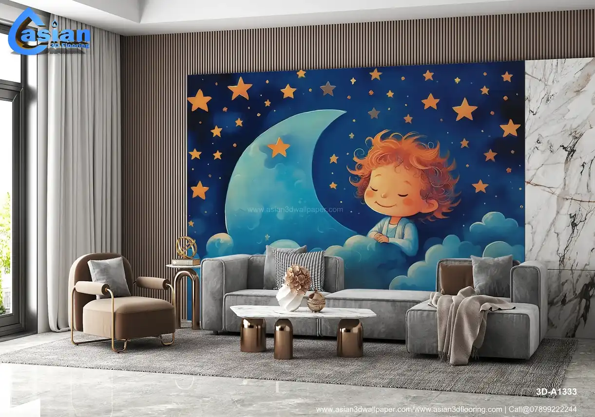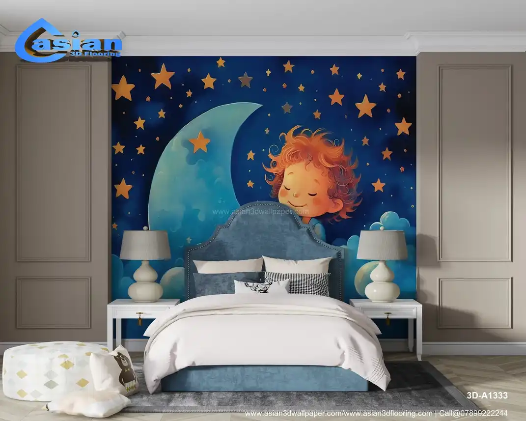 This charming illustration features a sleeping child with curly hair, surrounded by soft clouds and a starry night sky with a crescent moon. A peaceful and whimsical design, perfect for nurseries and children's rooms. Benefits:- A dreamy and whimsical wallpaper that adds a calming and soothing atmosphere to any child's room or nursery, perfect for bedtime.