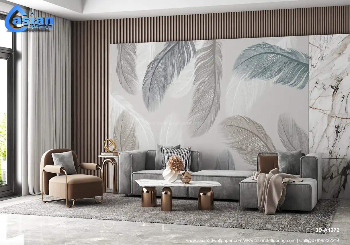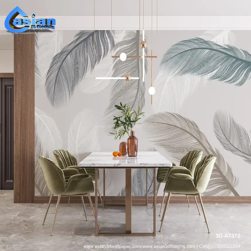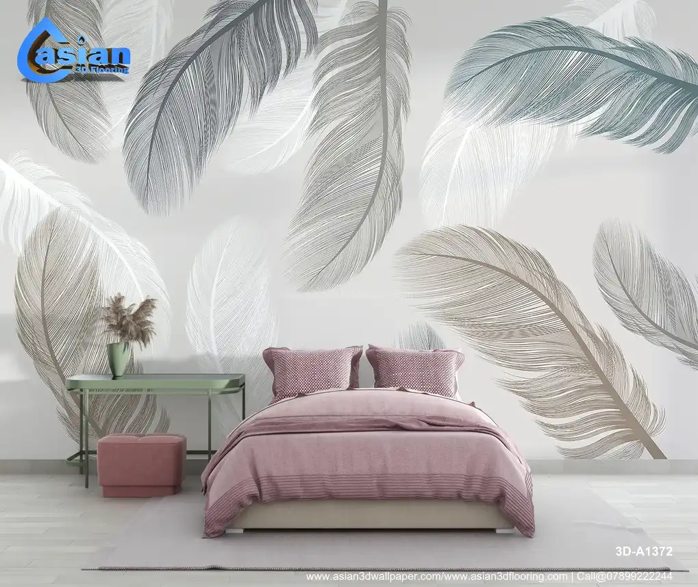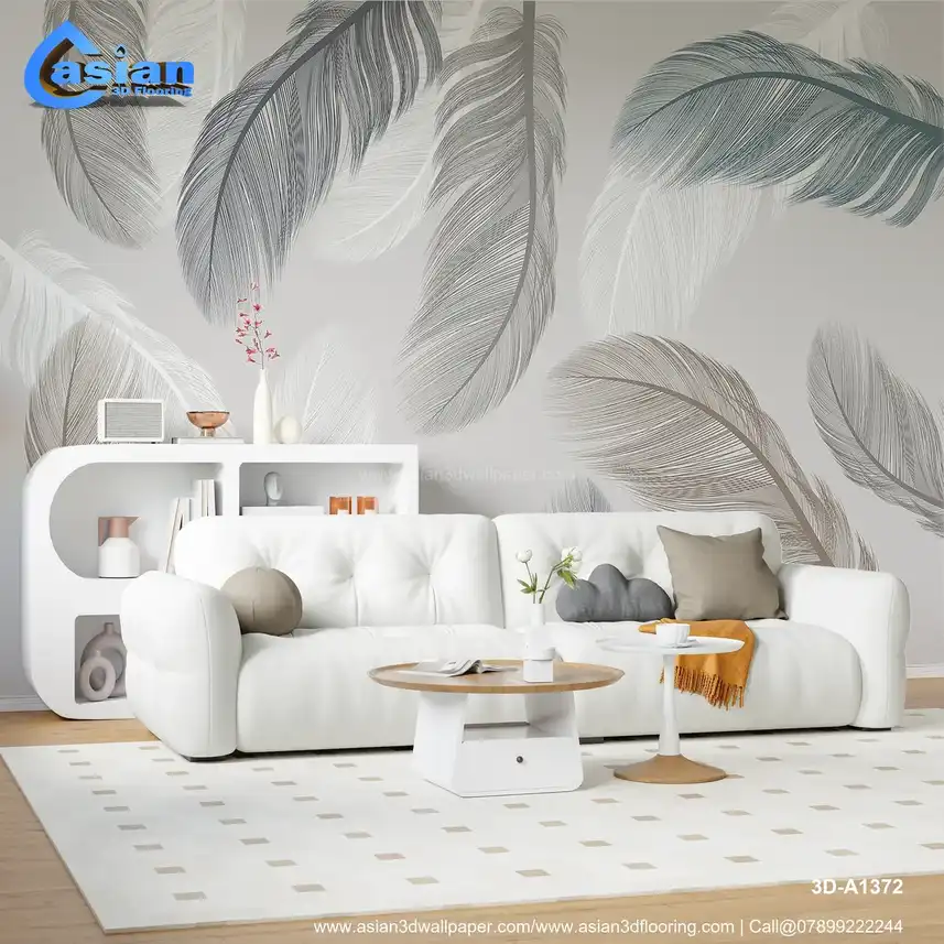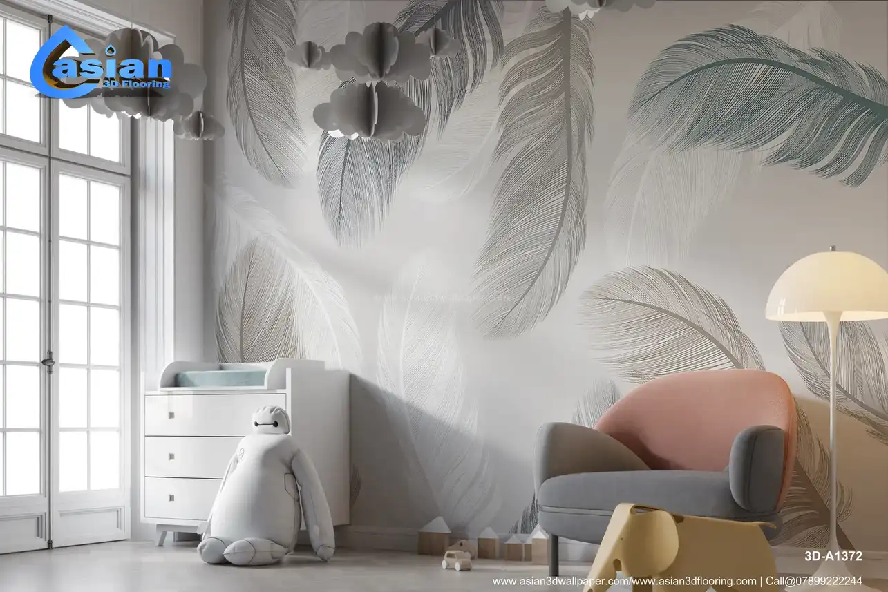 A delicate feather pattern wallpaper in soft shades of gray, white, and teal, perfect for creating a calming and elegant atmosphere in any room. Benefits:- Ideal for creating a peaceful and sophisticated ambiance in bedrooms or living rooms.