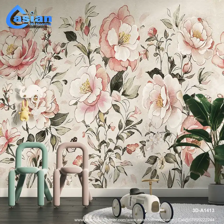 A beautiful watercolor wallpaper showcasing soft pink peonies and delicate floral details. This elegant design adds a touch of nature and tranquility to any room, making it perfect for living rooms, bedrooms, or spaces that need a soft floral touch. The gentle pastel colors enhance the serene atmosphere of the room. Benefits:- Creates a soothing, nature-inspired ambiance with its soft watercolor floral design, perfect for a tranquil and elegant home setting.