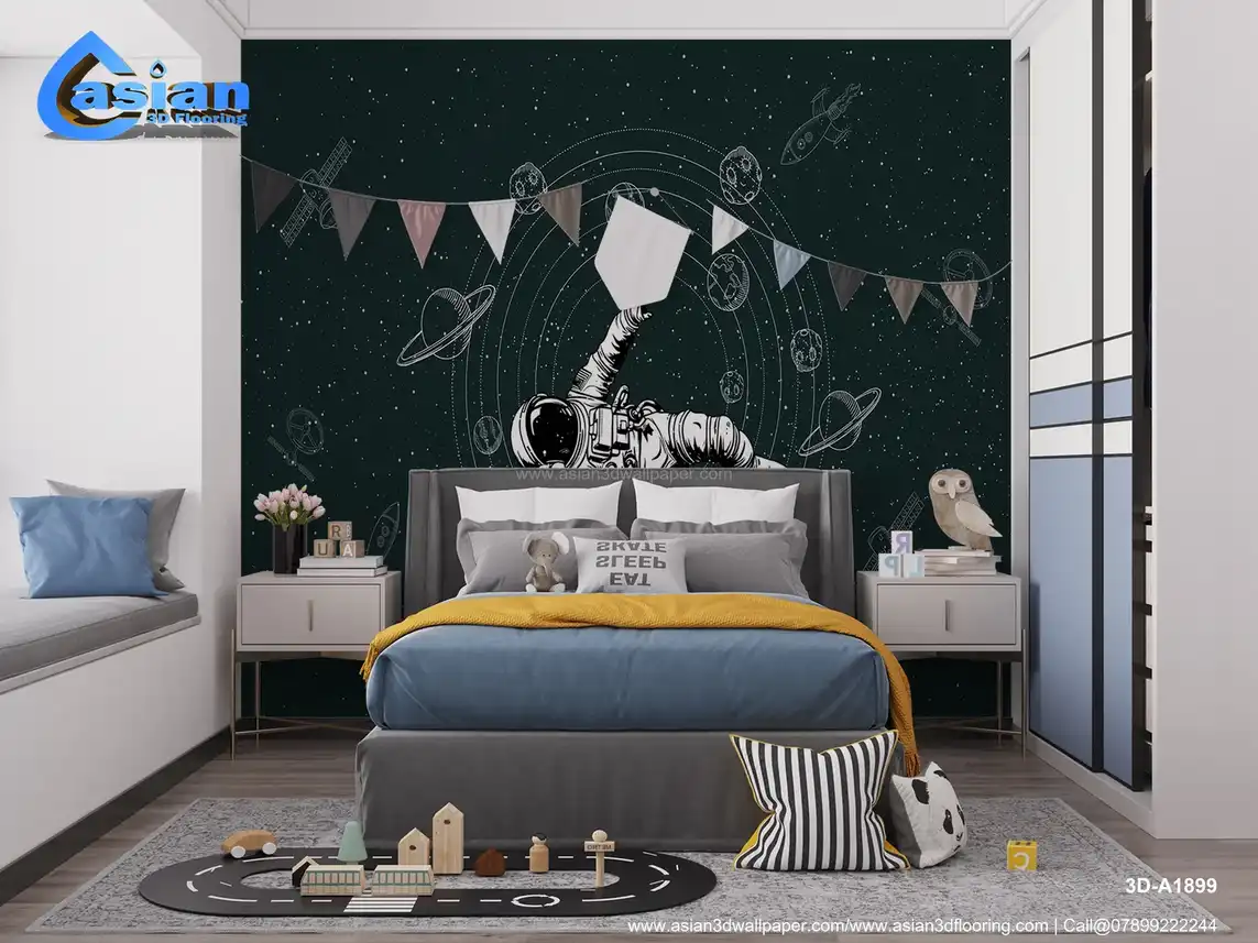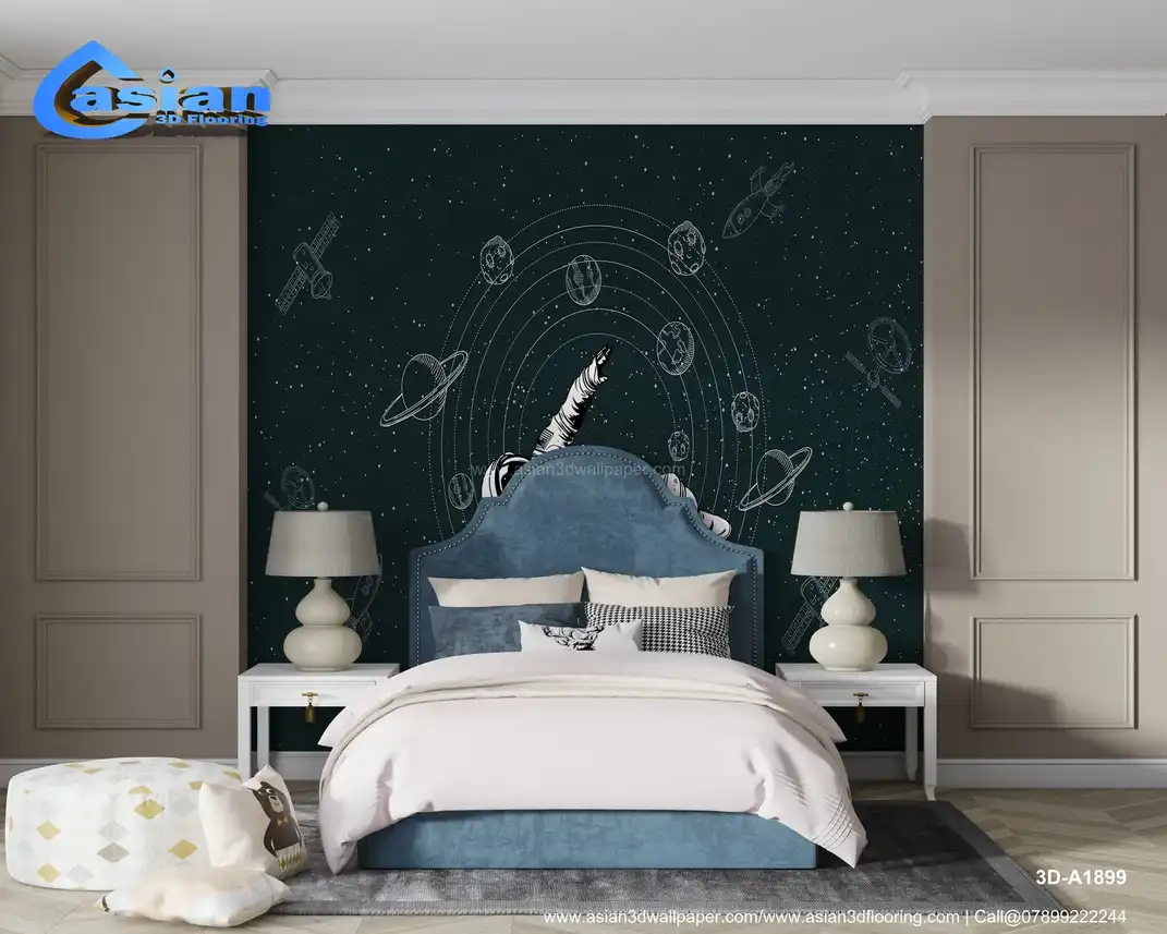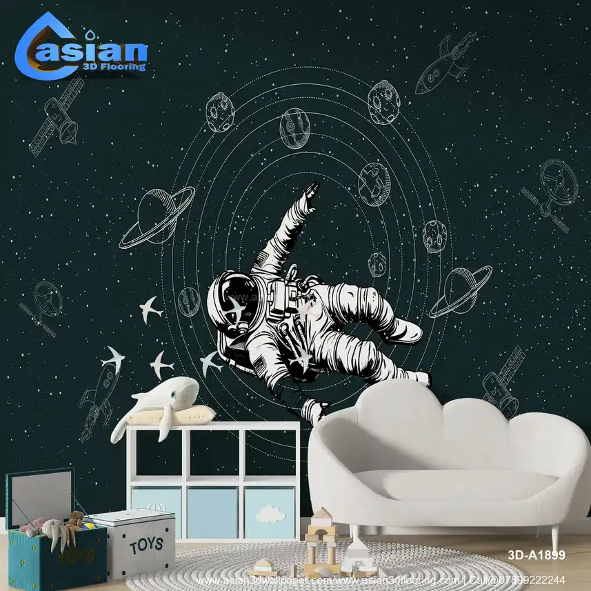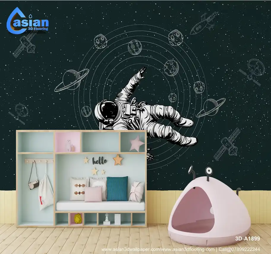 Space Themed Astronaut and Planetary Exploration Wallpaper (Dark Green)||3D-A1899