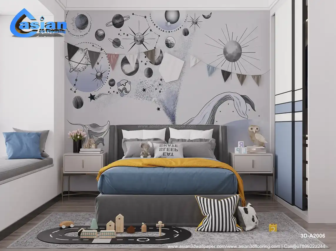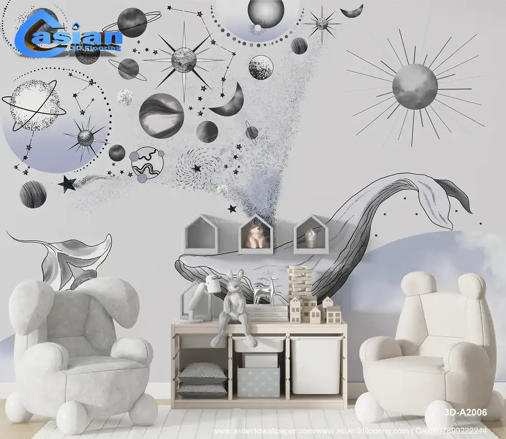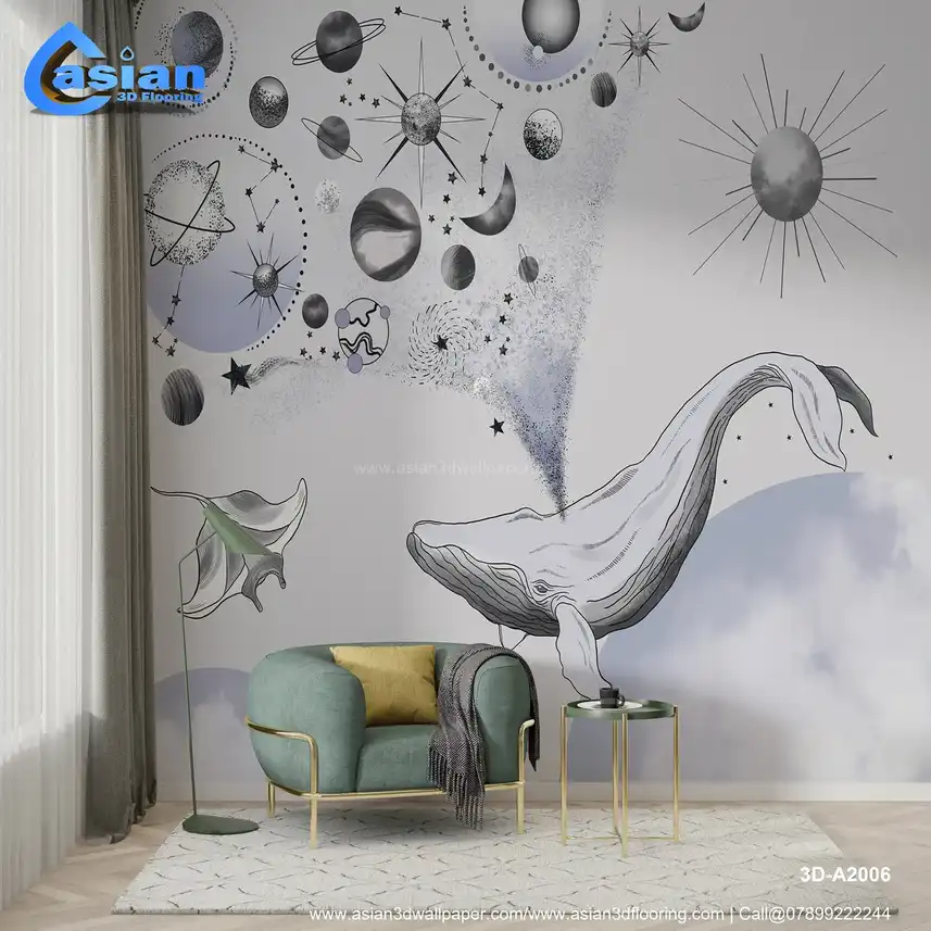 A mesmerizing space-themed wallpaper featuring a whale surrounded by stars, planets, and cosmic elements in shades of grey and blue. Ideal for a dreamy, celestial touch in any room. Benefits:- This celestial wallpaper features a beautiful whale amidst planets and stars, creating a serene and cosmic atmosphere in your room.