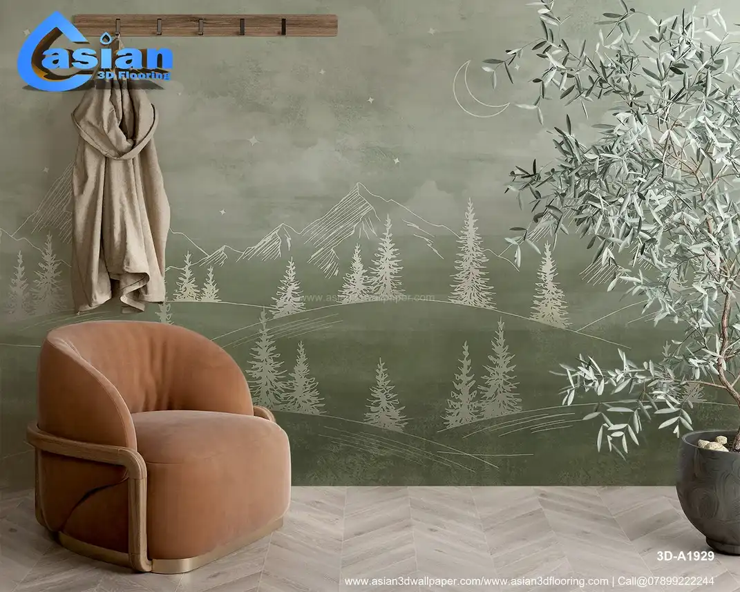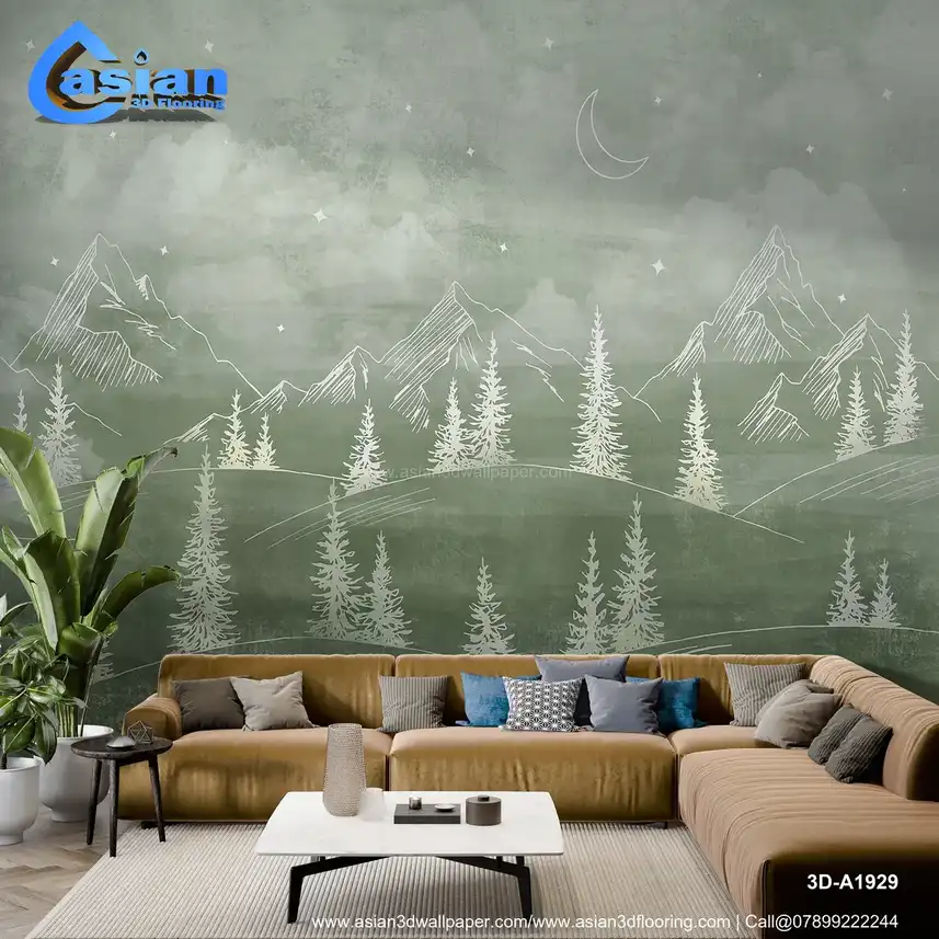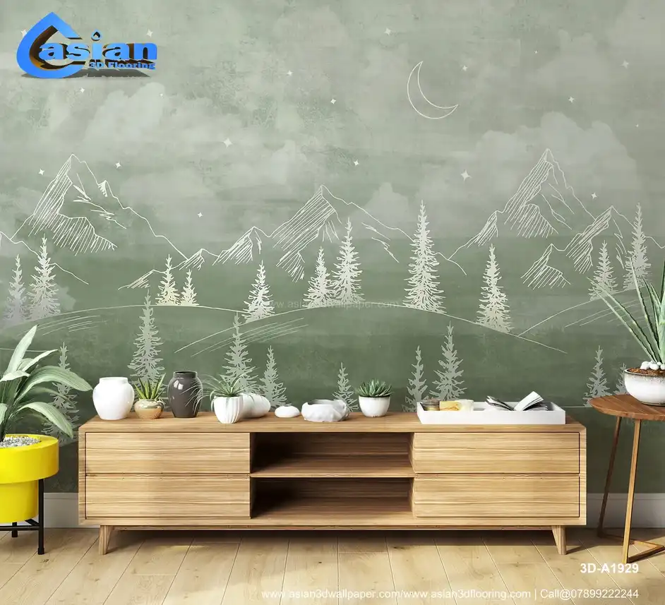 This calming wallpaper features a soft green landscape with mountains, pine trees, and a crescent moon in a serene night sky. The muted green tones create a tranquil atmosphere, ideal for bedrooms, living rooms, or any space that needs a soothing, nature-inspired touch. Benefits:- Ideal for creating a serene and calming atmosphere in bedrooms, living rooms, or spaces that require a nature-inspired and peaceful touch.