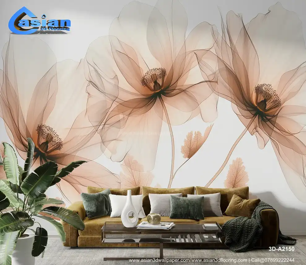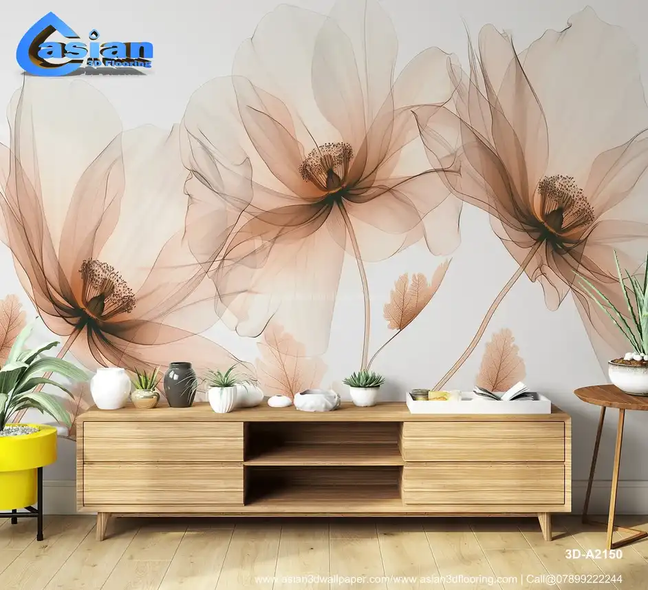 This image features three stylized flowers, possibly poppies or similar delicate blooms, in muted, translucent shades of beige, brown, and off-white against a plain white background. The petals are depicted with a semi-transparent, almost ethereal quality, creating a soft and airy effect. The stamens are more defined, providing a focal point. Small, stylized leaves are also present, adding to the botanical feel. The overall impression is delicate, elegant, and modern. Ideal for creating a sophisticated and calming atmosphere in living rooms, bedrooms, studios, or as a stylish desktop or phone background. High-resolution image available for download. Benefits:- Creates a sophisticated and calming atmosphere with a touch of modern elegance and delicate beauty. The translucent effect and muted color palette are visually appealing and versatile. High-resolution image suitable for various applications. Free download available.