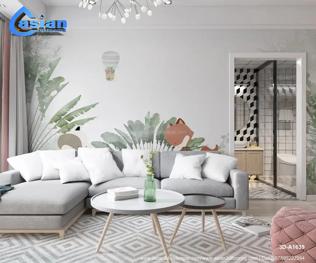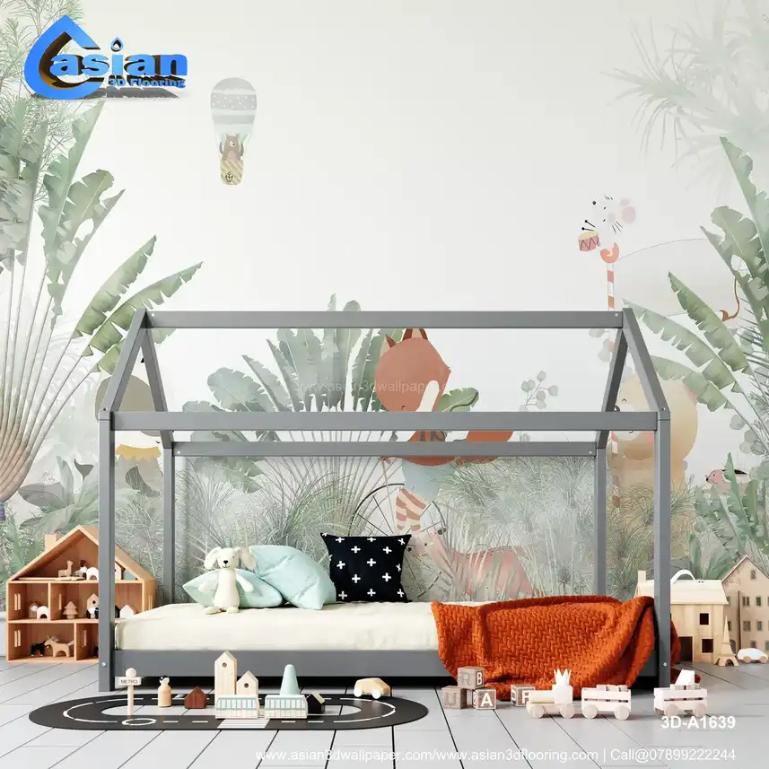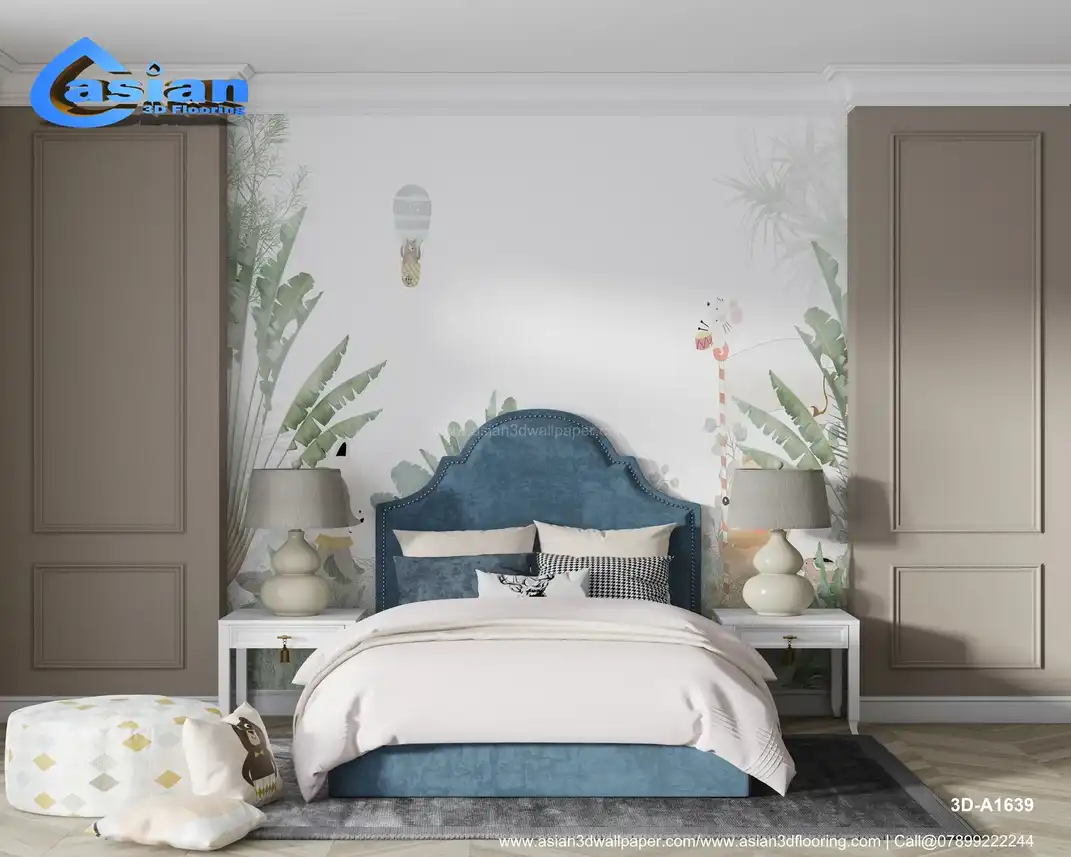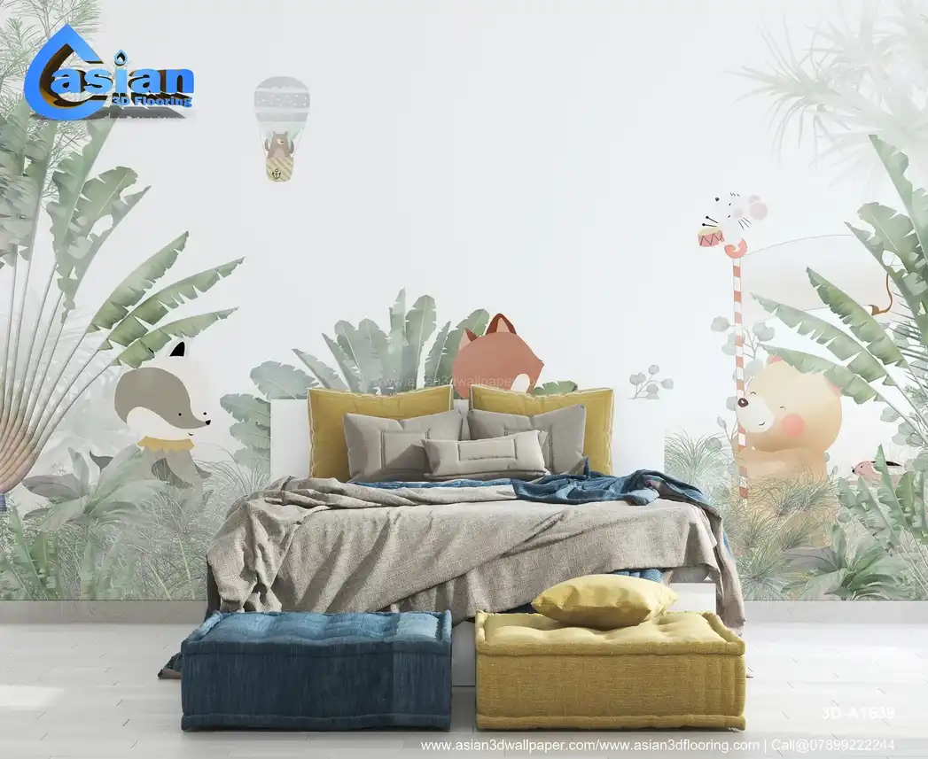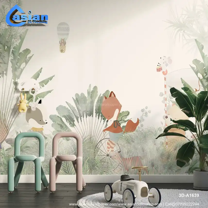 This whimsical wallpaper showcases a bear in a hot air balloon, a fox, a mouse playing a drum, and other friendly animals surrounded by lush tropical greenery. Ideal for children's rooms or nurseries, it creates an enchanting, nature-inspired atmosphere. Benefits:- Perfect for creating a playful and imaginative space for children, with delightful animals in a lush tropical jungle.