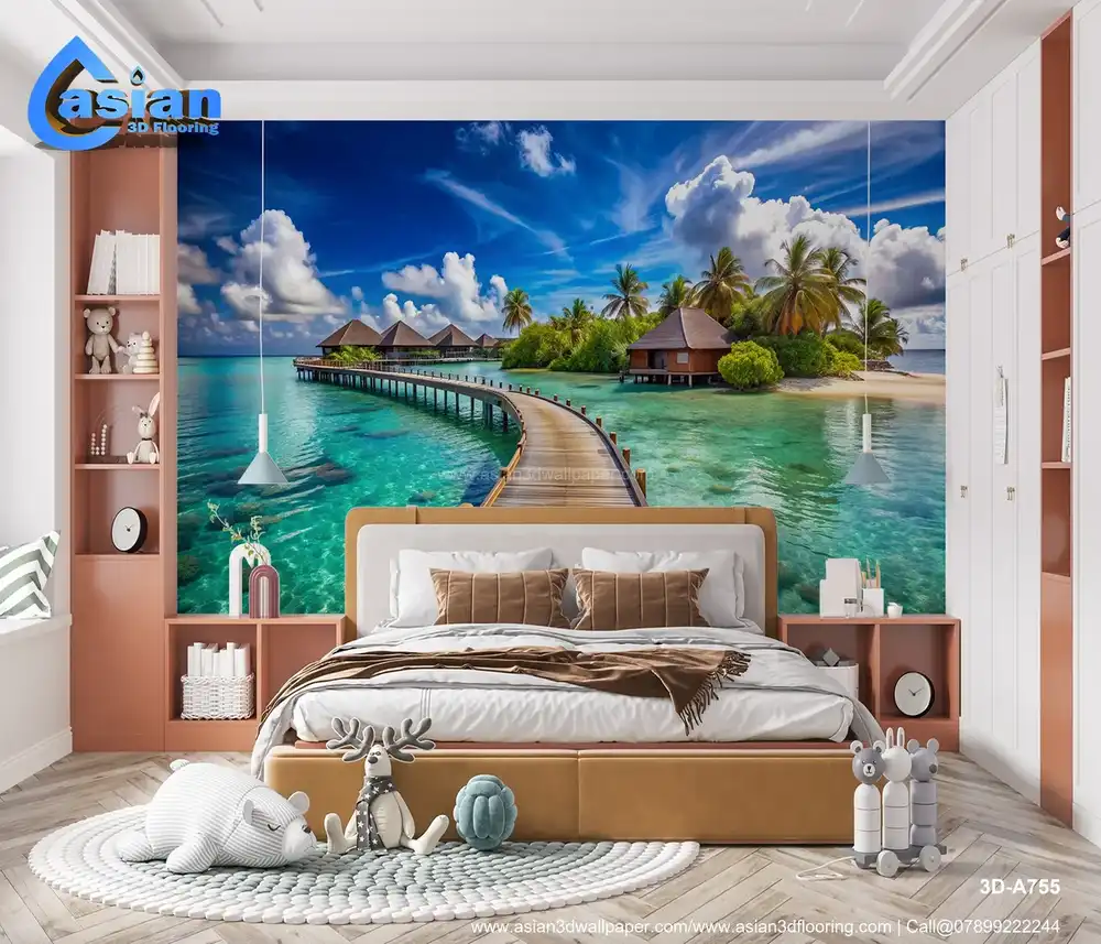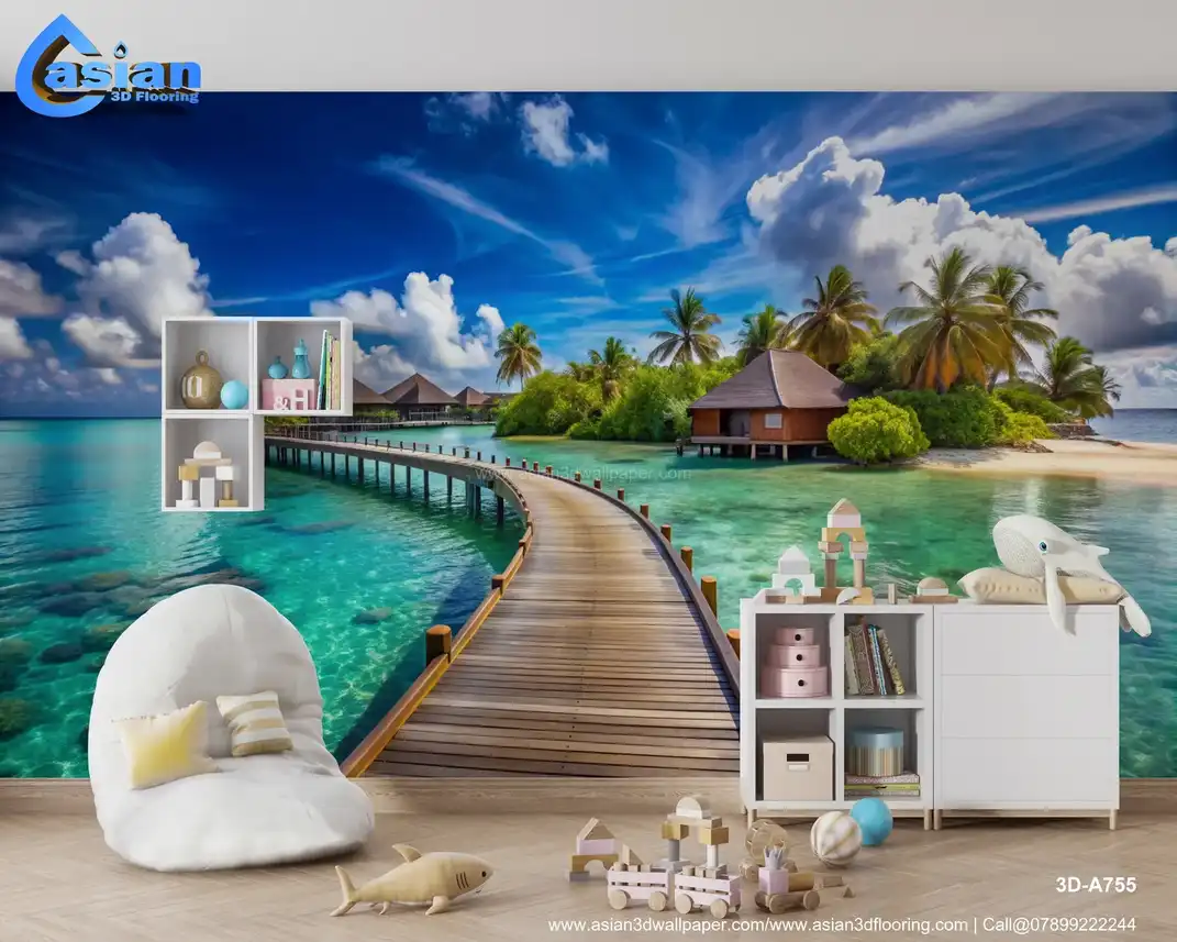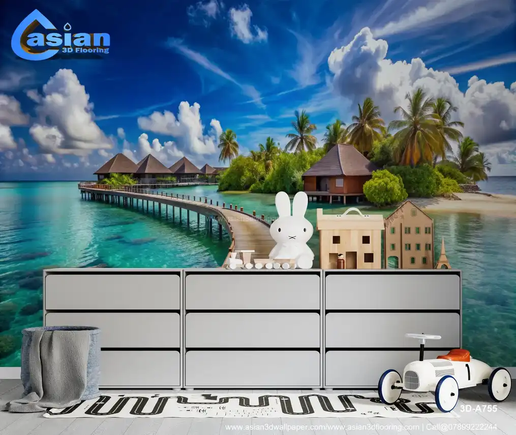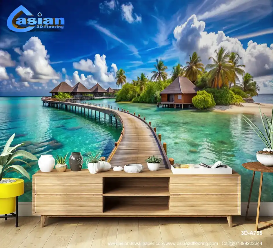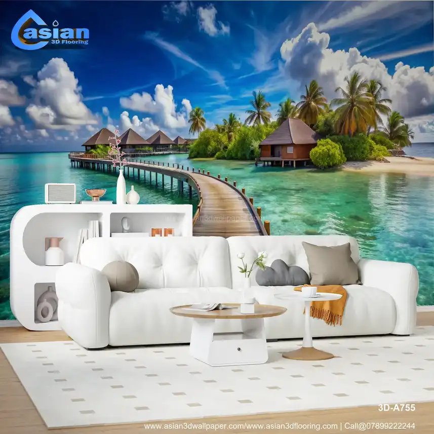 Immerse yourself in this stunning tropical scene featuring picturesque overwater bungalows surrounded by crystal-clear turquoise waters. The vibrant blue sky and fluffy white clouds create a perfect backdrop, inviting you to experience the tranquility and beauty of this serene getaway. Ideal for those dreaming of a vacation paradise or looking to infuse their space with a touch of coastal charm. Benefits:- Perfect for enhancing relaxation spaces, living rooms, or offices with a serene coastal aesthetic.