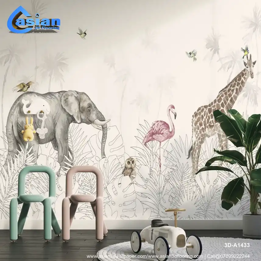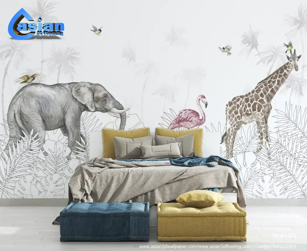 Tropical Safari Animals: Elephant, Giraffe, Flamingo, Owl Wall Mural||3D-A1433