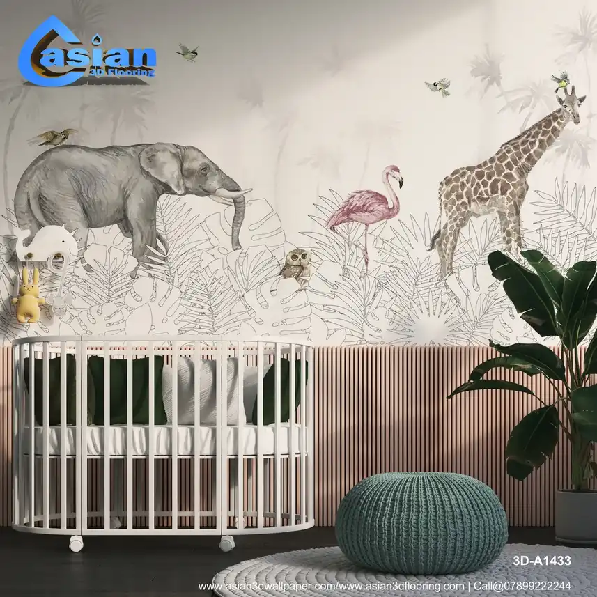 Bring the wild beauty of the safari into your space with this tropical wall mural featuring a playful elephant, elegant giraffe, pink flamingo, and wise owl. Set against a soft, neutral background, the delicate line-drawn foliage enhances the jungle theme. Ideal for children's rooms, play areas, or nature lovers' spaces, this mural adds an adventurous touch while promoting a calm and whimsical atmosphere. Benefits:- Adds an adventurous yet calming touch with wildlife animals and tropical foliage, perfect for creating a whimsical space.