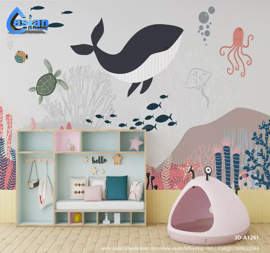 This delightful underwater-themed wallpaper features a playful whale, turtle, and various sea creatures like fish, octopus, and manta rays swimming through vibrant coral reefs. Ideal for children's rooms, nurseries, or bathrooms, this design brings the beauty of the ocean into the space, while also sparking curiosity about marine life. The soft pastel hues and playful illustrations make this wallpaper perfect for creating a fun, educational, and calming atmosphere. Benefits:- A fun and vibrant underwater wallpaper featuring a whale, turtle, and other sea creatures, perfect for kids' rooms and nurseries.