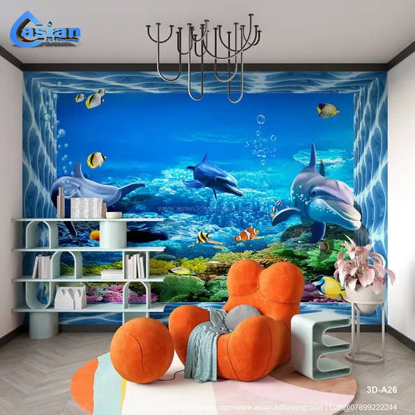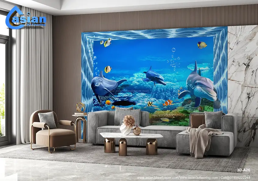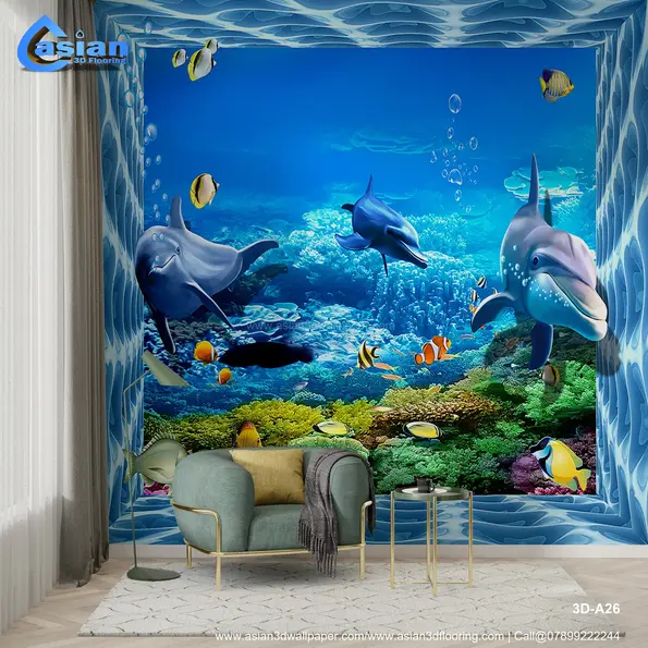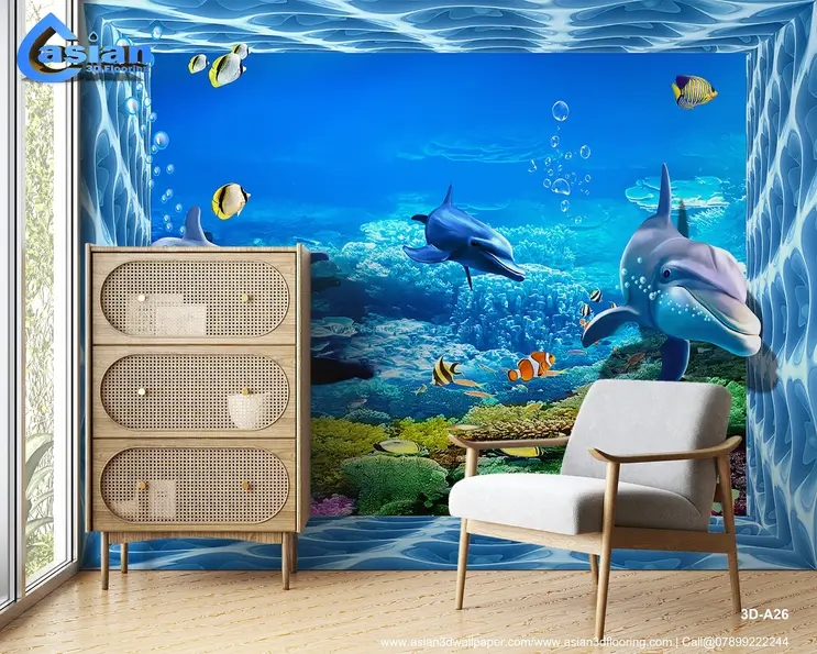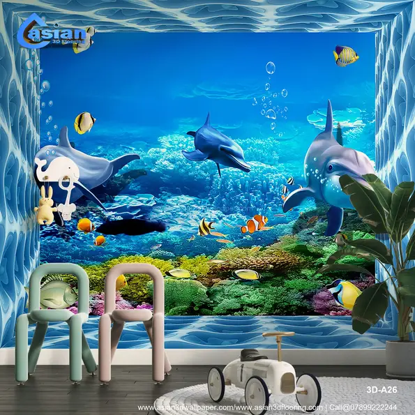 Dive into an enchanting underwater world with this vibrant wallpaper featuring playful dolphins surrounded by colorful coral reefs and exotic tropical fish. The design captures the beauty of marine life with bright blue waters and intricate aquatic details, making it perfect for kids' rooms, aquariums, or playful home interiors. This wallpaper creates a lively, imaginative ambiance that brings the ocean?s magic into your space. Product Benefits :- Brings the vibrant magic of the ocean indoors. Sparks imagination and creativity in kids. Ideal for aquariums, kids' rooms, or playful interiors. Adds lively and colorful marine details to spaces.