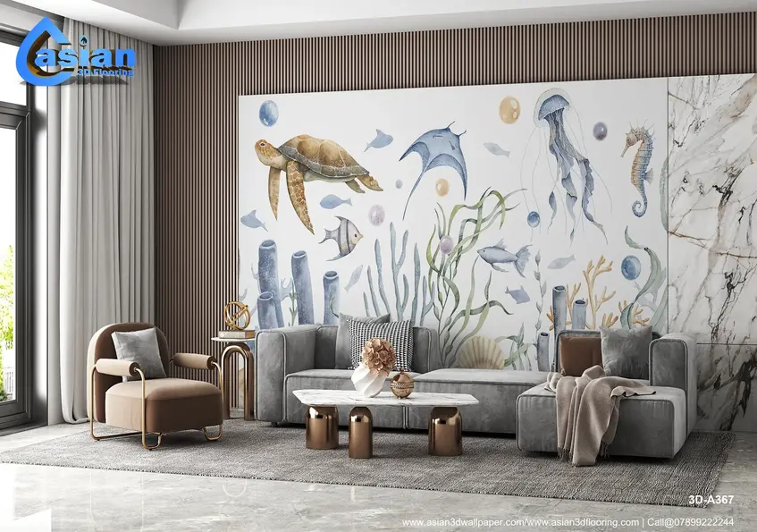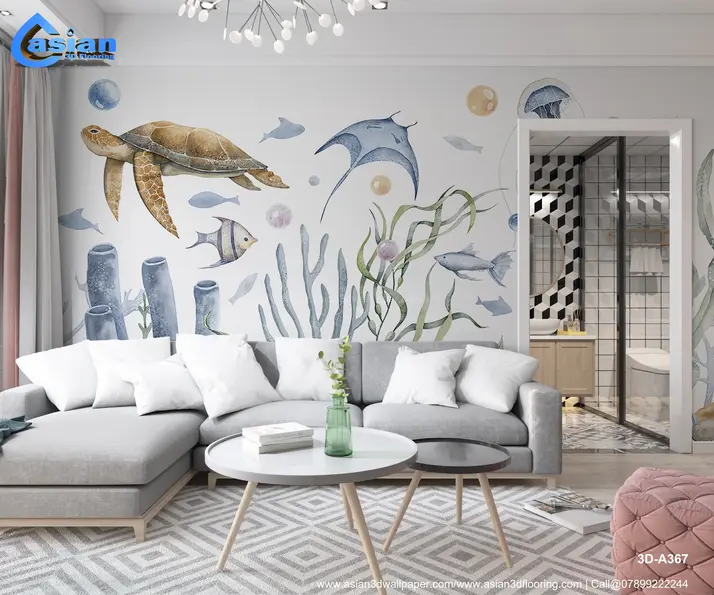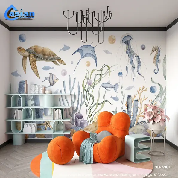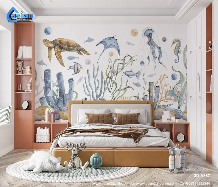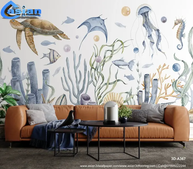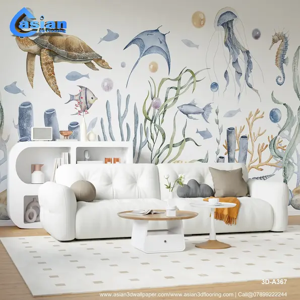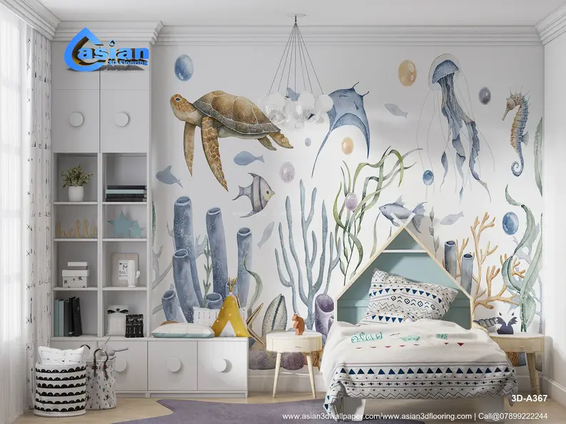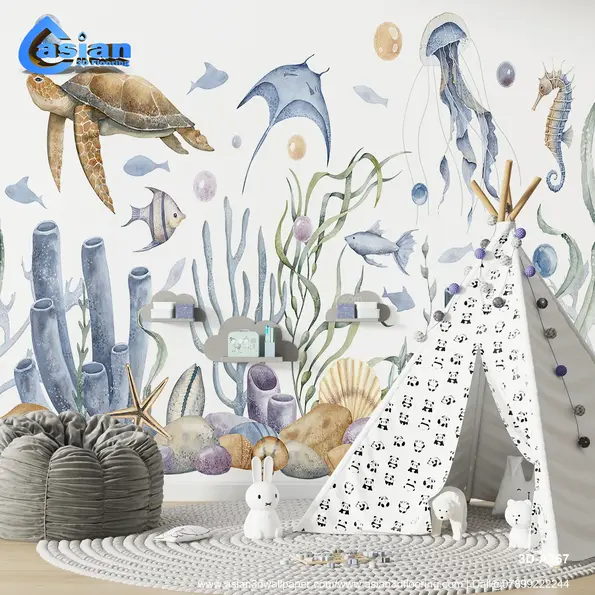 Dive into the serene beauty of ocean life with this mural showcasing sea turtles, jellyfish, coral reefs, and other aquatic creatures. Ideal for transforming any child?s room into an underwater adventure with its soft, calming tones and marine details. Product Benefits :- Creates an imaginative underwater world perfect for kids? bedrooms, nurseries, or playrooms. Encourages a love for marine life and exploration.