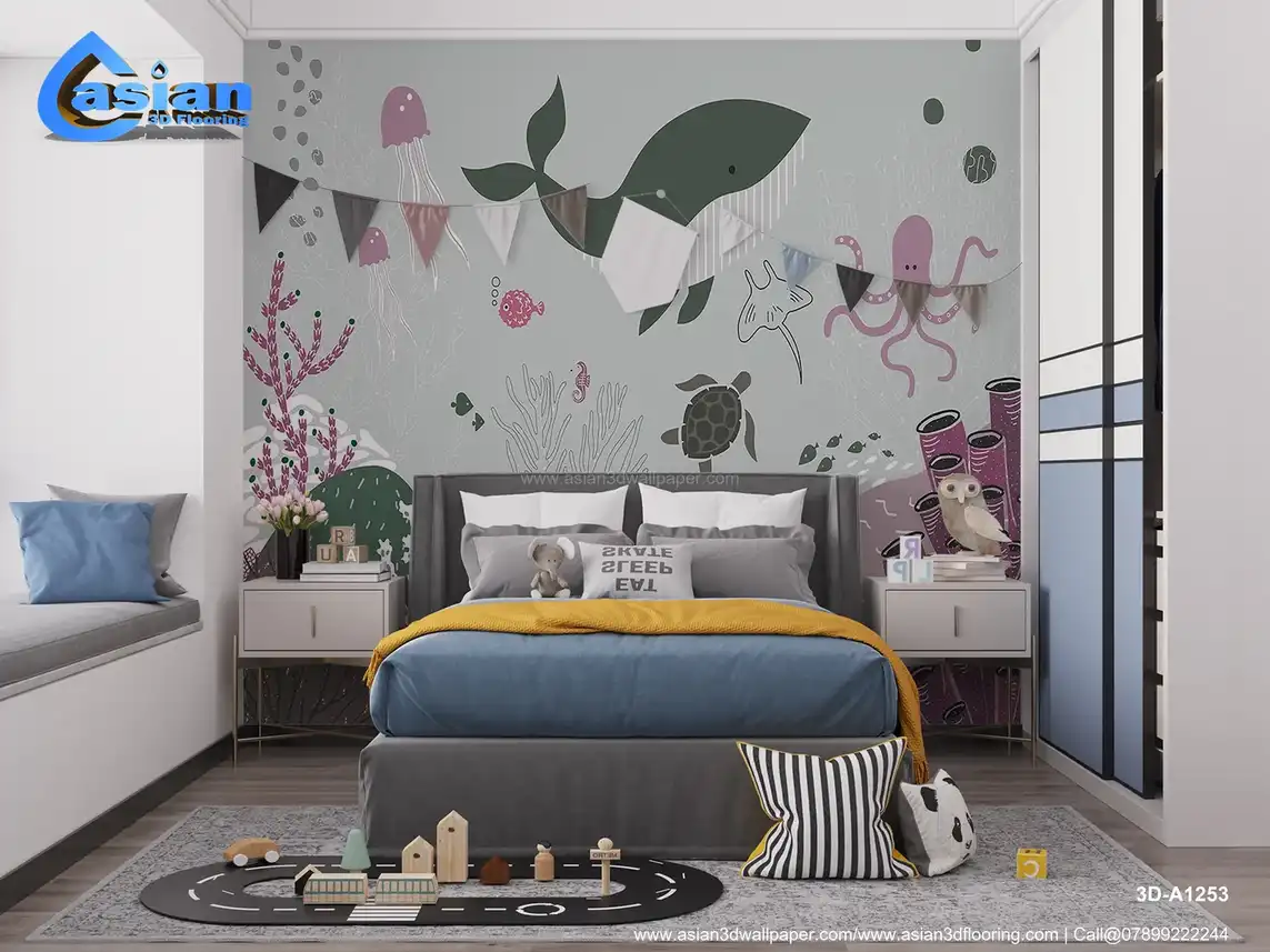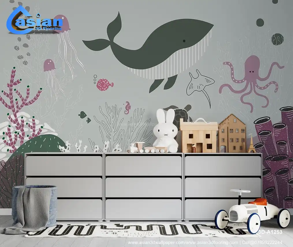 Underwater Ocean Life Wallpaper with Whale, Turtle, and Jellyfish||3D-A1253