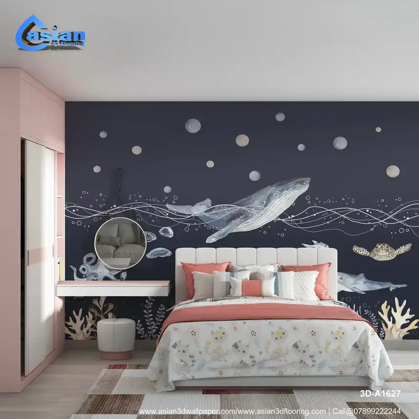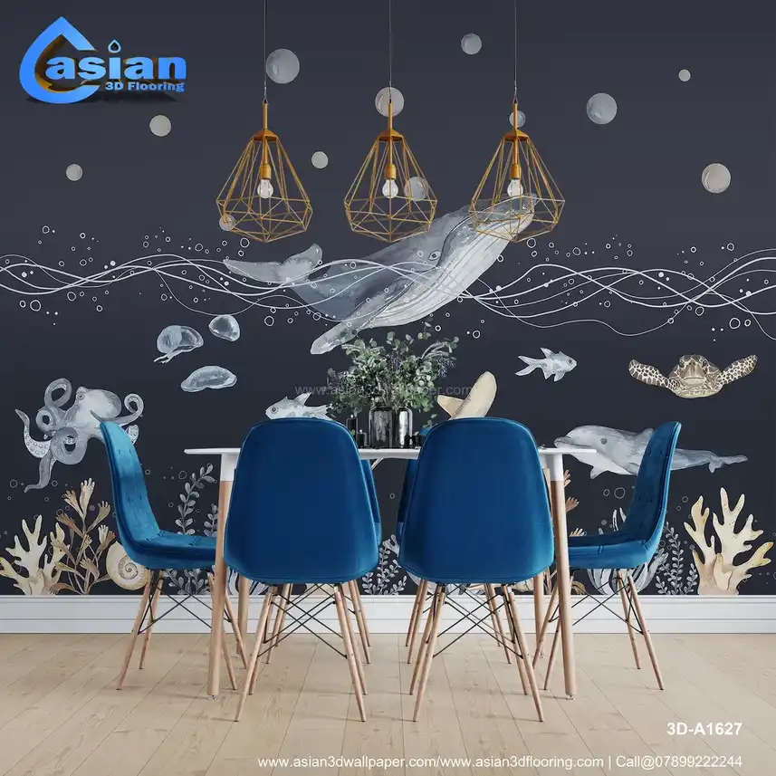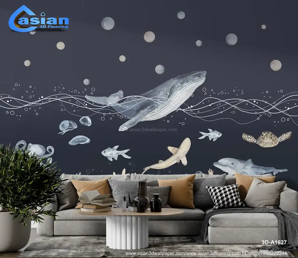 Dive deeper into the ocean with this stunning wallpaper, featuring a whale, dolphins, jellyfish, octopus, and vibrant coral reefs. The darker hues and calming water bubbles create a peaceful and serene underwater world. Perfect for bedrooms, bathrooms, or kids? rooms, bringing the wonders of the deep sea to life. Benefits:- Ideal for creating a peaceful and relaxing atmosphere with the serene deep-sea creatures and coral reef designs.