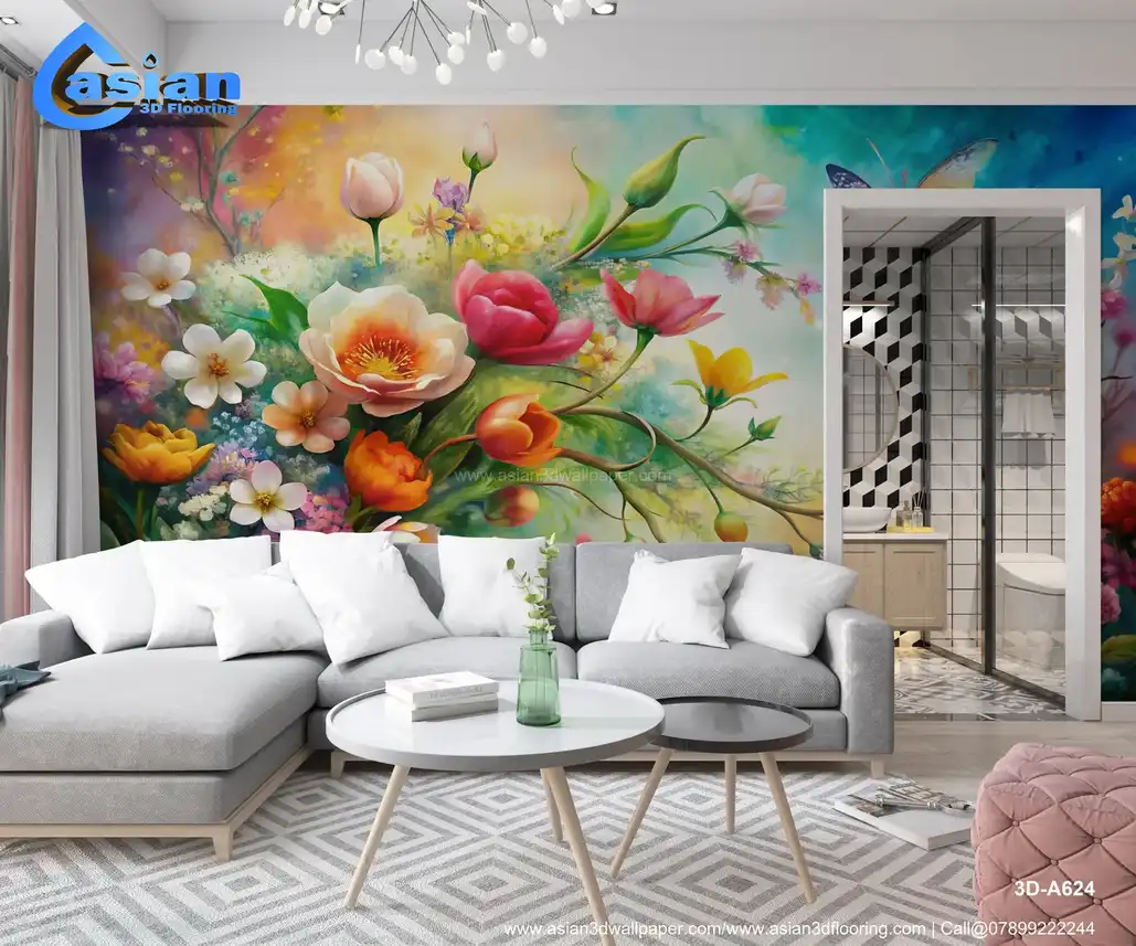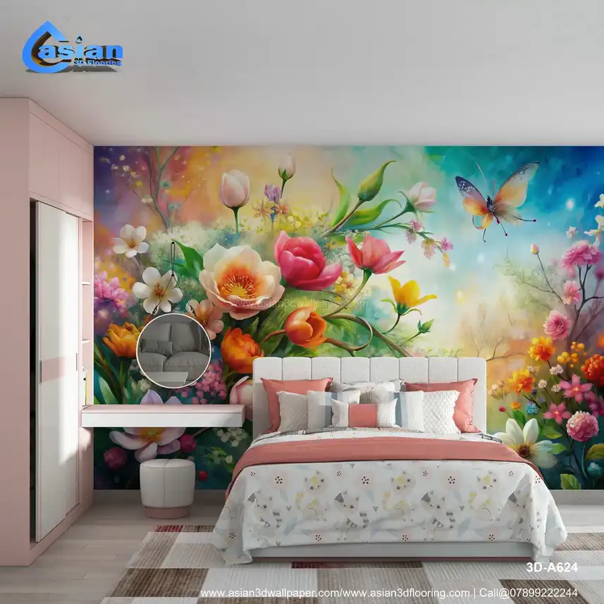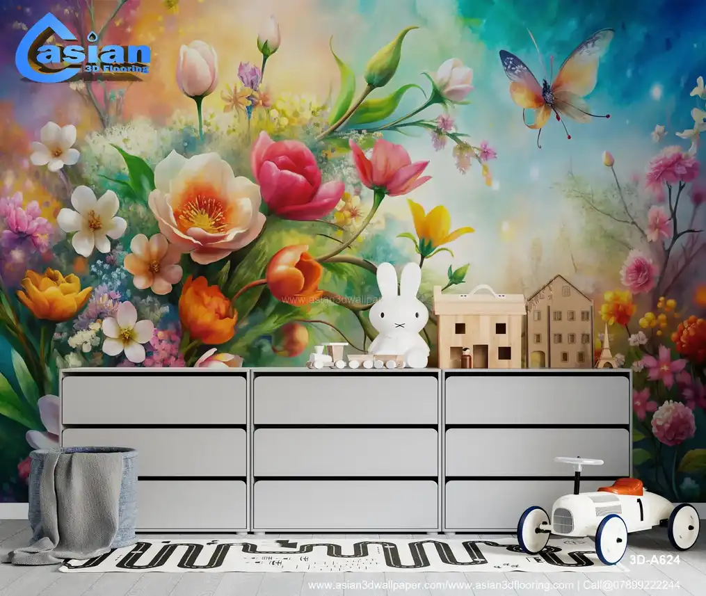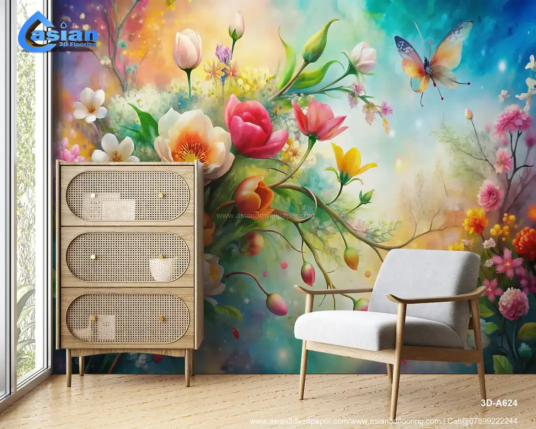 Vibrant Floral Fantasy Wallpaper with Butterfly||3D-A624