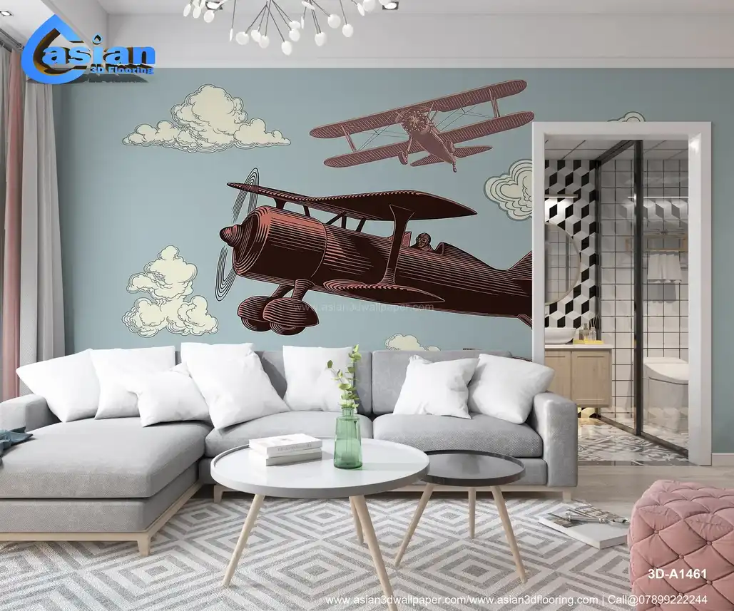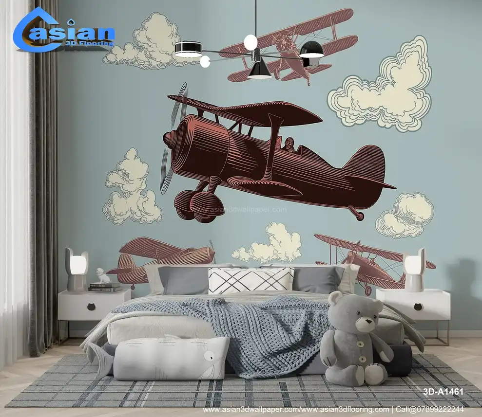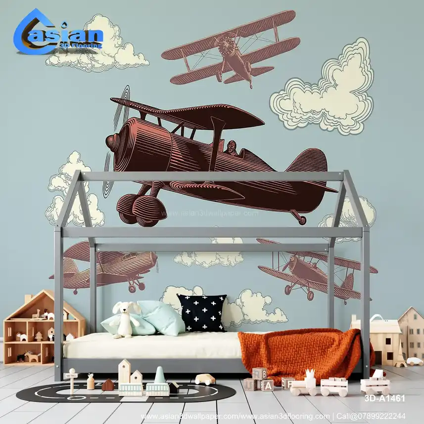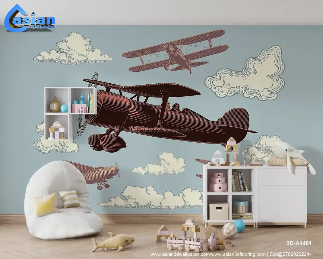 This captivating wallpaper showcases vintage airplanes flying through the sky, surrounded by soft clouds and a muted background. The design features detailed illustrations of classic aircraft in flight, offering a sense of adventure and nostalgia. Perfect for adding a playful, aviation-inspired touch to kids' rooms, nurseries, or spaces with a retro theme. Benefits:- Adds a sense of adventure and nostalgia, perfect for creating a fun and imaginative atmosphere in kids' rooms, nurseries, or retro-themed spaces.
