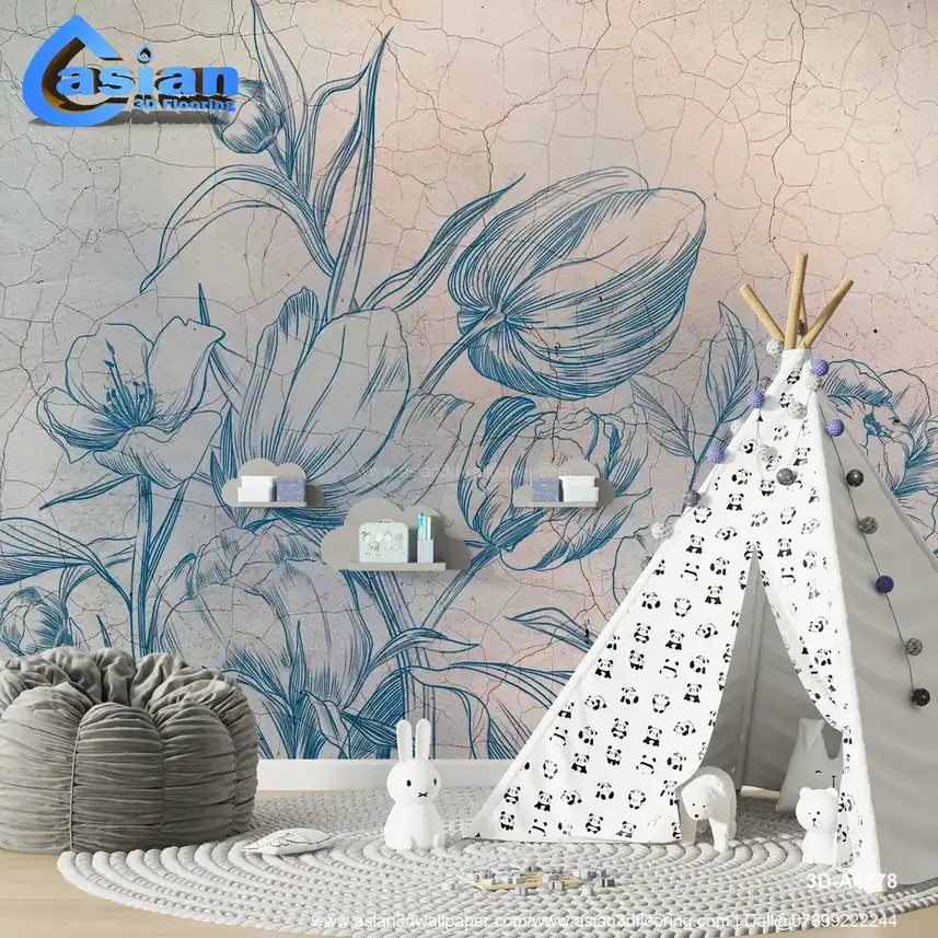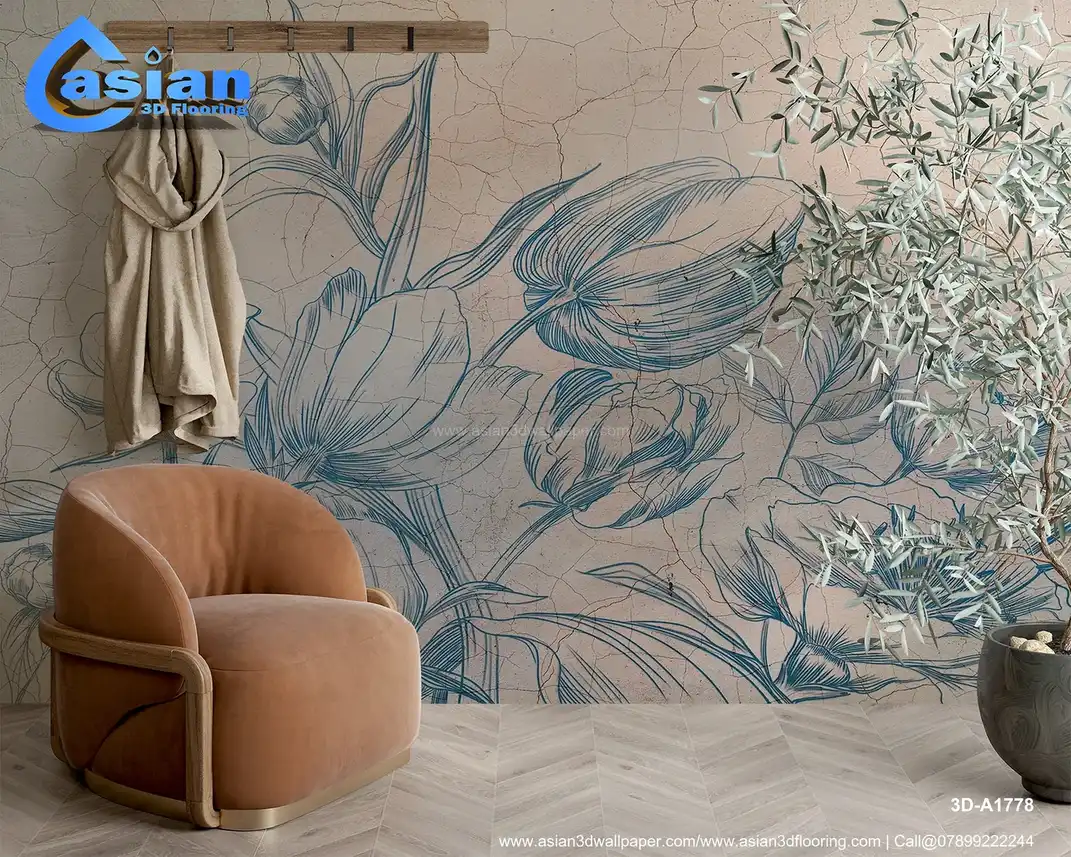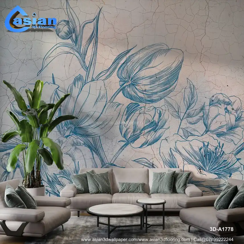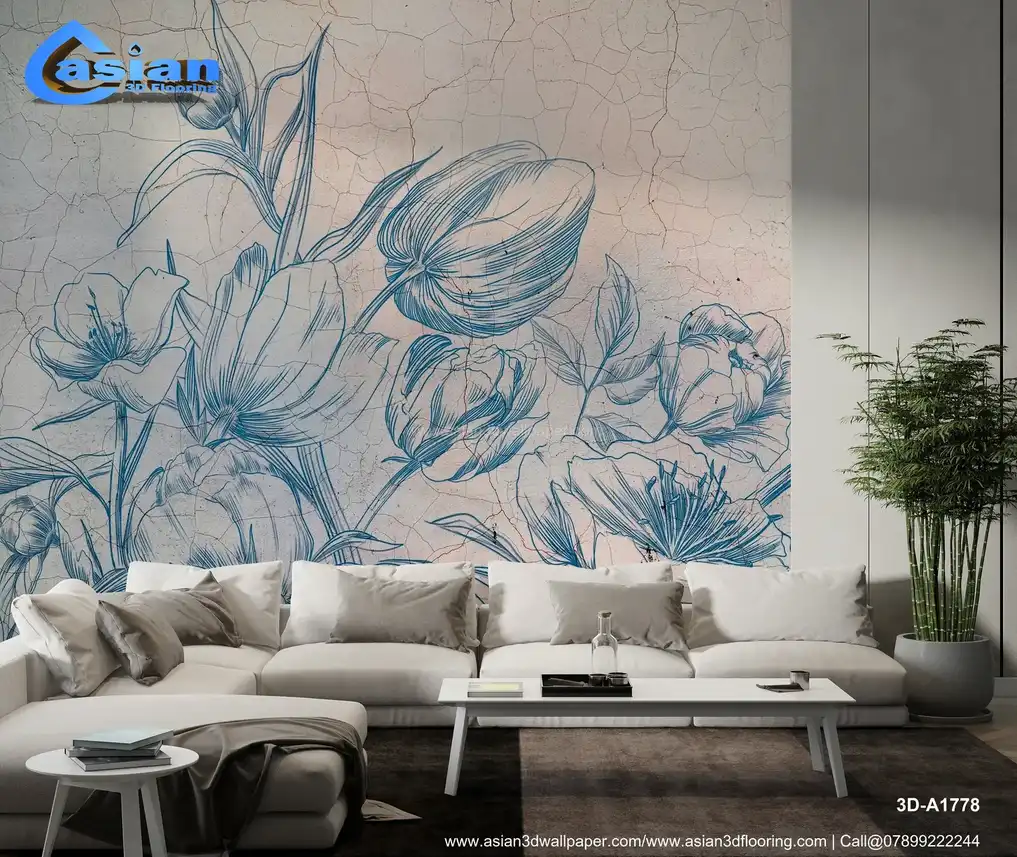 Vintage Blue Floral Line Art Wallpaper||3D-A1778