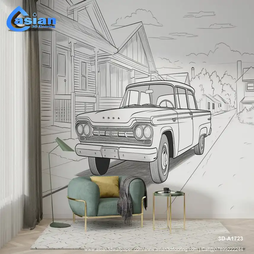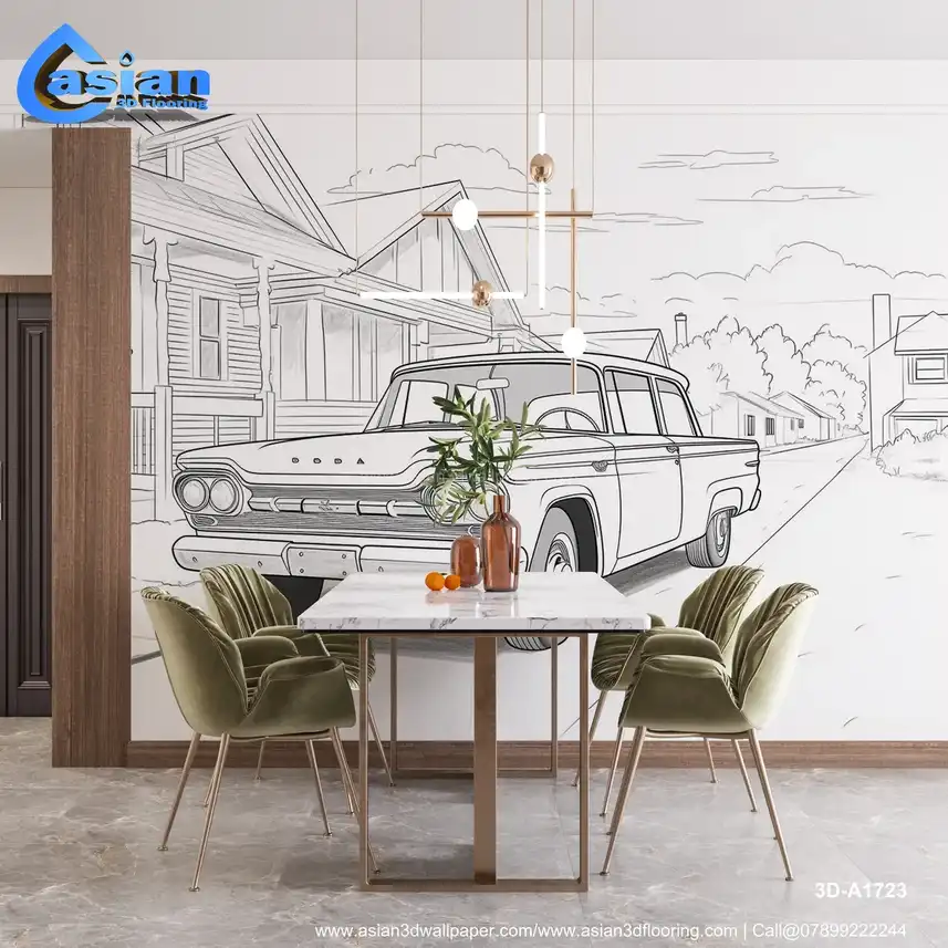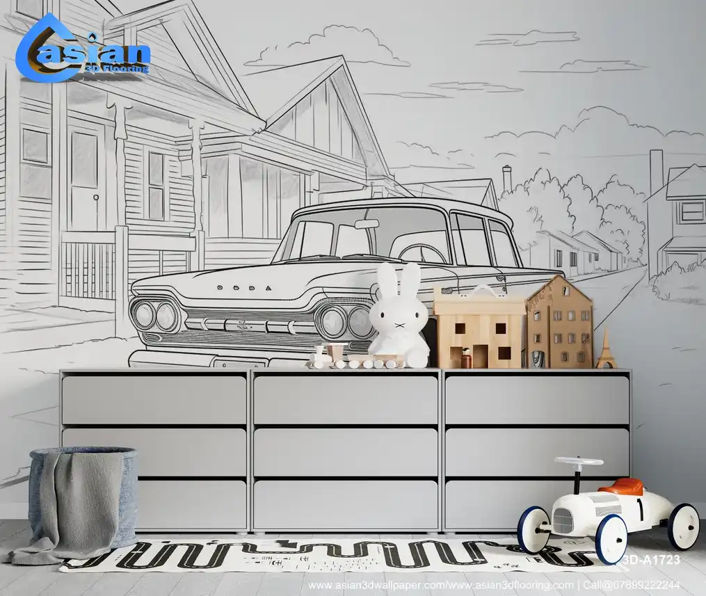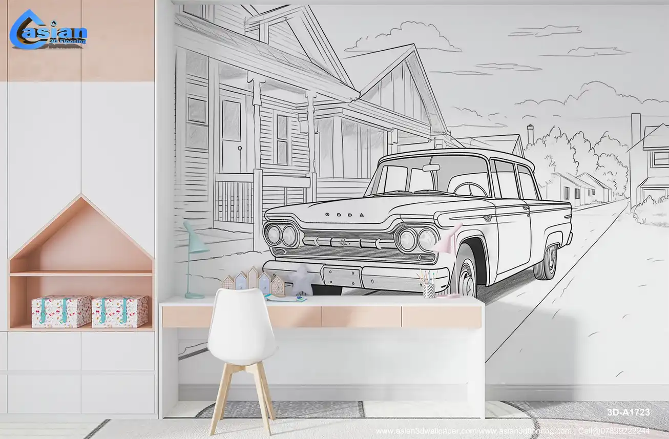 A hand-drawn sketch of a classic 1960s sedan, featuring a vintage Dodge car on a suburban street with a retro atmosphere. Benefits:- A beautifully detailed hand-drawn sketch of a 1960s Dodge sedan, showcasing the classic design and nostalgic appeal of retro cars.