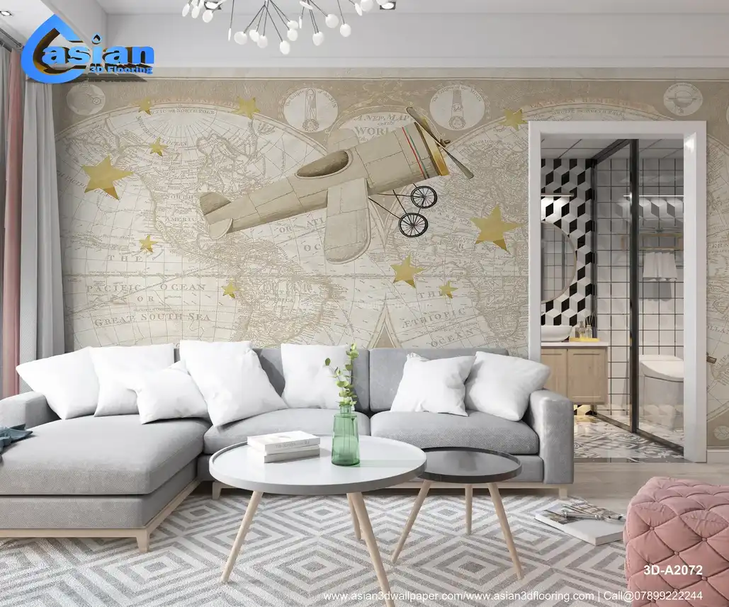 Vintage Travel Map Wallpaper - Airplane, Telescope & World Map Art||3D-A2072