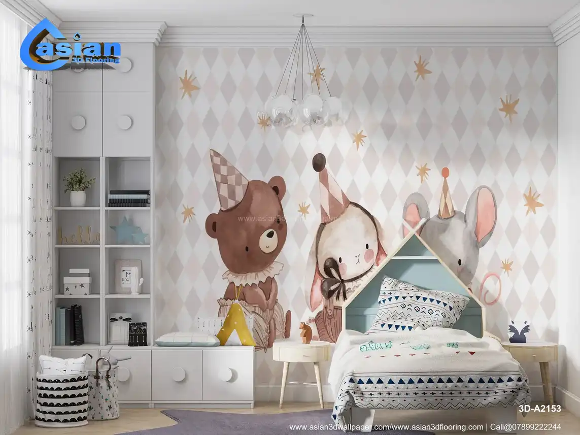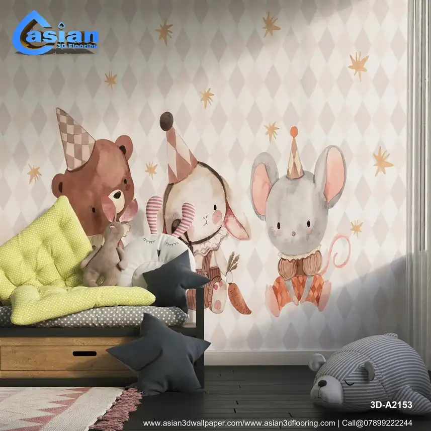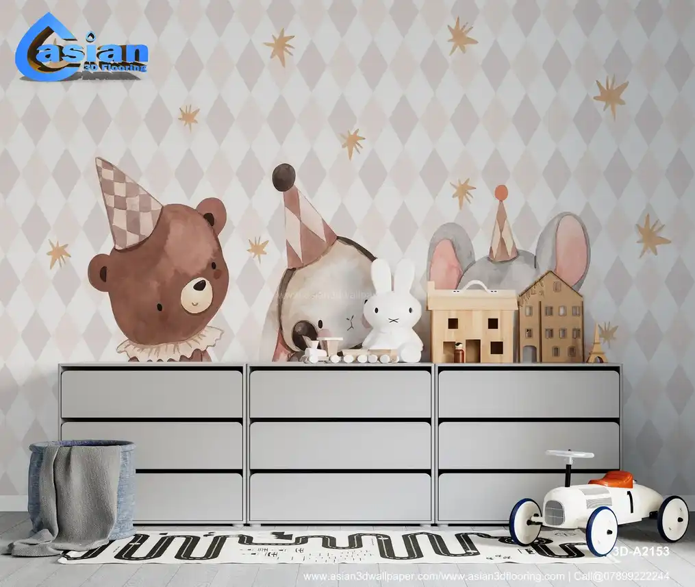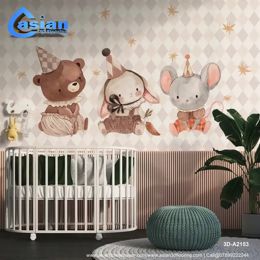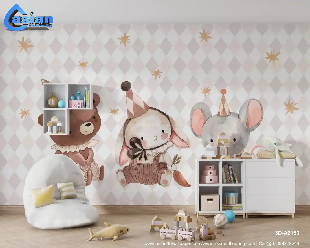 This charming image features three adorable, cartoon-style animals ? a brown bear, a white rabbit, and a gray mouse ? against a light beige background with a subtle diamond pattern. The animals are rendered in a soft, watercolor-like style, giving them a gentle and whimsical appearance. They are all wearing party hats and have a playful look. Small, scattered gold or yellow stars add a festive touch. The overall mood is playful, whimsical, and charming, making it perfect for children's illustrations, nursery decor, baby shower invitations, birthday cards, or as a cute desktop or phone background. High-resolution image available for download. Benefits:- Creates a playful, whimsical, and charming atmosphere, perfect for children and baby-related projects. The soft watercolor style and cute animal depictions are visually appealing and heartwarming. High-resolution image suitable for various applications. Free download available.