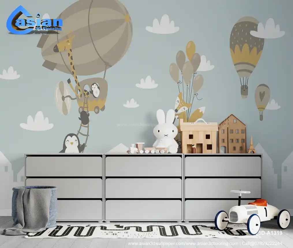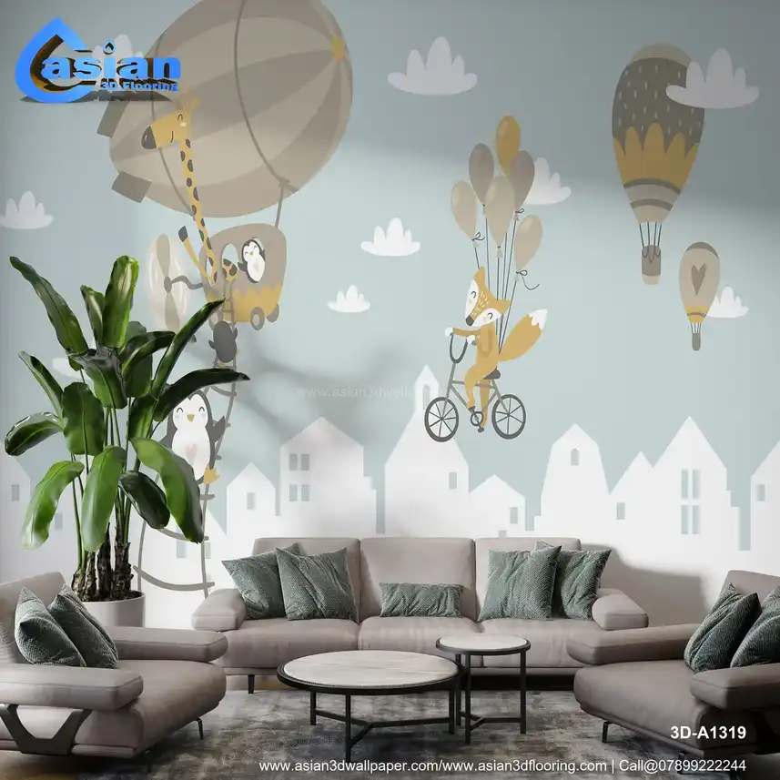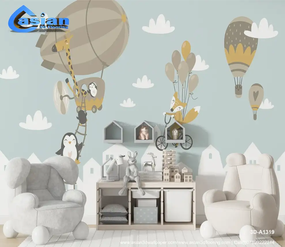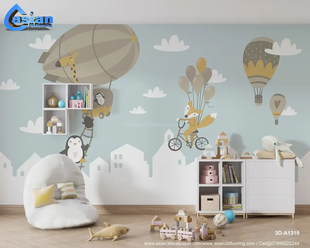 This playful wallpaper brings a whimsical animal adventure to life, featuring a giraffe flying in a hot air balloon, a fox riding a bike with colorful balloons, and penguins climbing a ladder towards the sky. The soft blue background and pastel tones make it a perfect addition to any child's room, creating a fun and imaginative atmosphere. Ideal for nurseries, playrooms, or bedrooms, this wallpaper inspires creativity and joy in little ones. Benefits:- Bring a sense of adventure and fun to your child's space with this whimsical animal-themed wallpaper featuring hot air balloons, penguins, and a fox.
