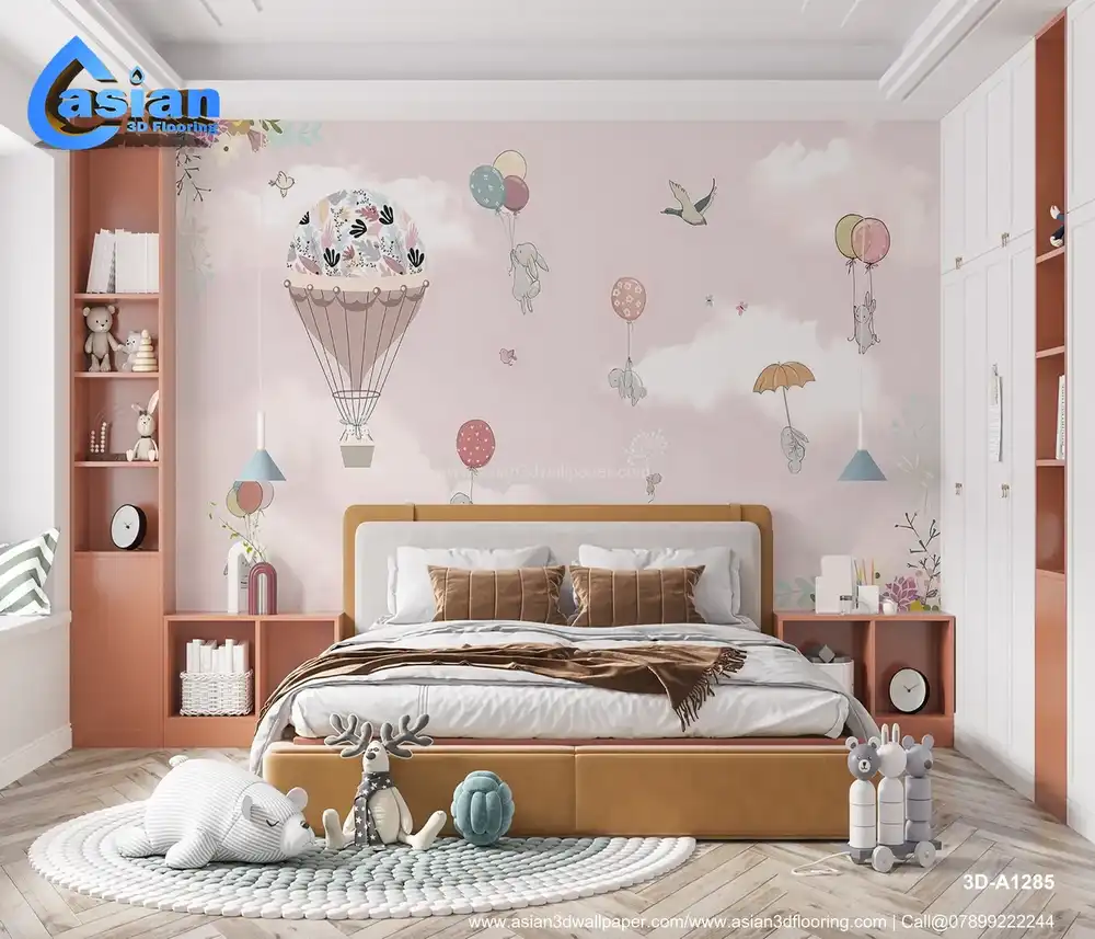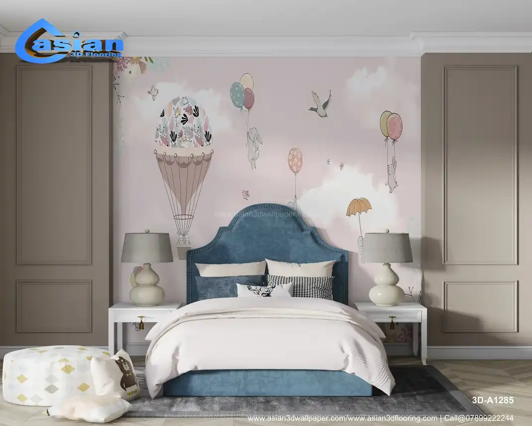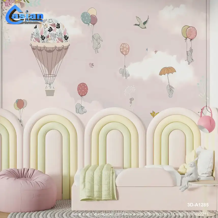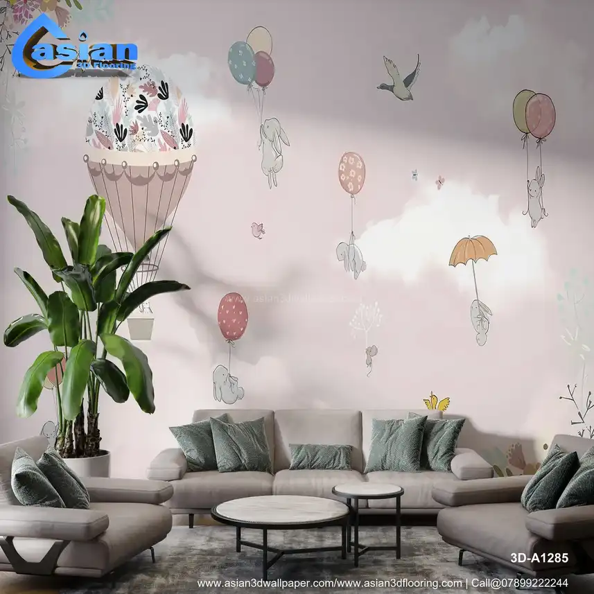 This adorable wallpaper design features bunnies and birds floating among the clouds with colorful balloons and a charming hot air balloon. Soft pastel tones of pink, yellow, and blue create a dreamy atmosphere, making this wallpaper perfect for nurseries, children's rooms, or any playful space. The whimsical design brings joy and serenity, with adorable flying bunnies and birds that spark the imagination of both children and adults. Benefits:- A charming wallpaper featuring bunnies, birds, and colorful balloons, perfect for creating a serene and playful environment in nurseries or children's rooms.
