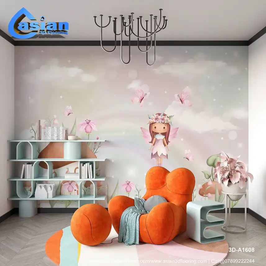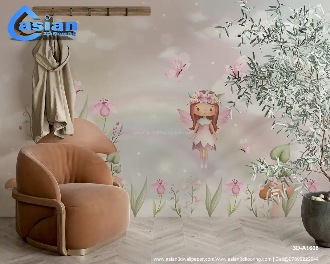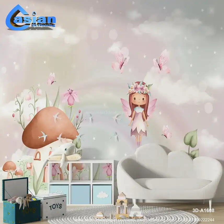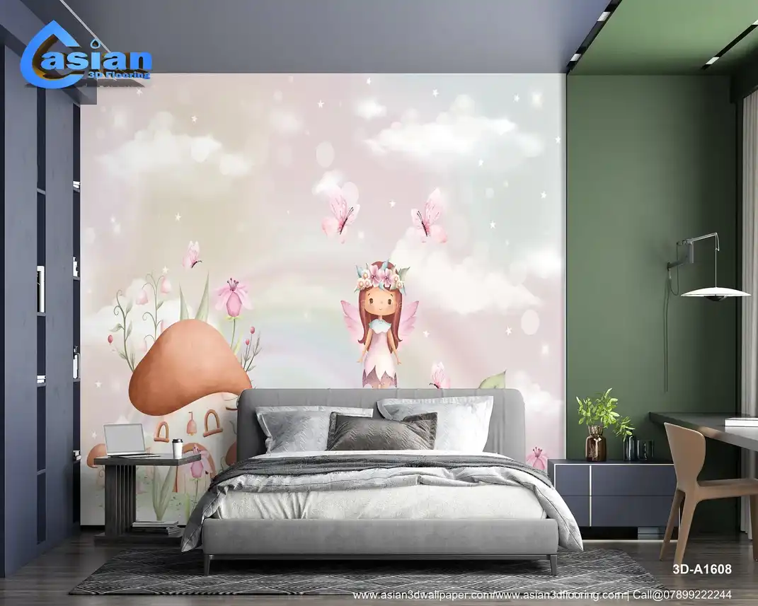 Step into a magical world with this enchanting wallpaper featuring a fairy floating above a mushroom house, surrounded by soft pastel flowers and fluttering butterflies. This dreamlike scene, filled with delicate details like stars and clouds, creates a serene, fairy-tale atmosphere. Perfect for children's rooms, nurseries, or any space seeking a touch of whimsical charm. The soft pinks, purples, and greens bring warmth and tranquility, making it ideal for creating a cozy, magical space. Benefits:- This whimsical wallpaper brings a touch of magic to any room with its soft pastel hues, charming fairy figures, and a peaceful, dreamy atmosphere. Ideal for children?s rooms, nurseries, or any space in need of a whimsical touch.