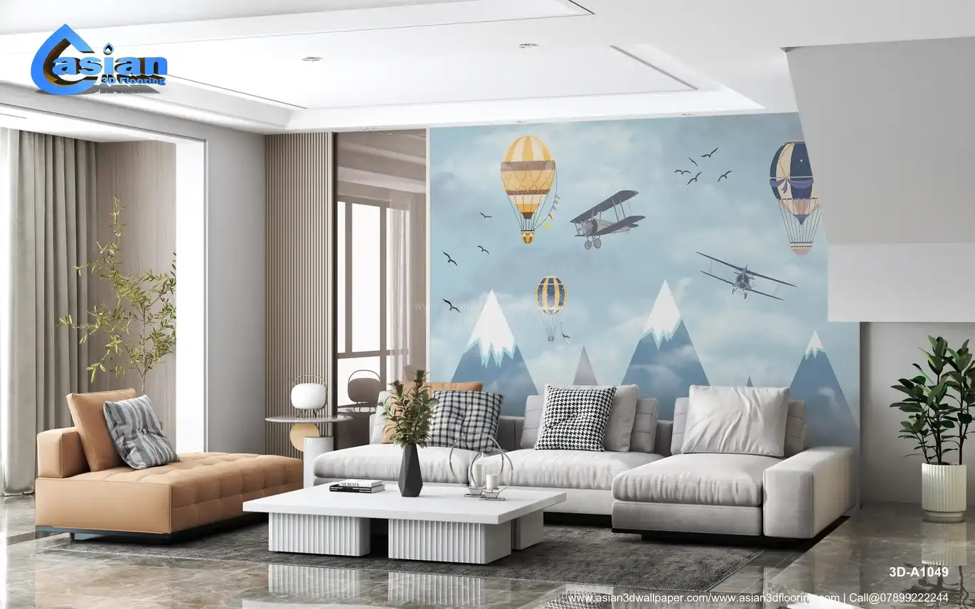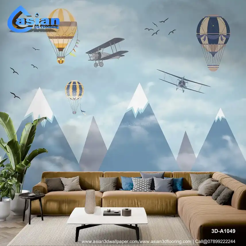 Whimsical Hot Air Balloon and Mountain Wallpaper||3D-A1049
