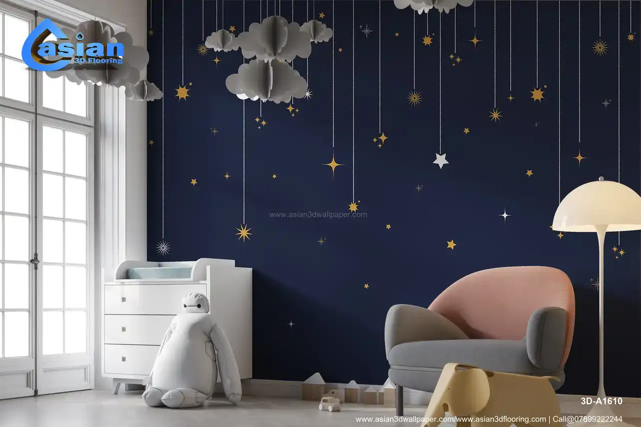 Whimsical Starry Night Sky Wallpaper with Golden Stars||3D-A1610