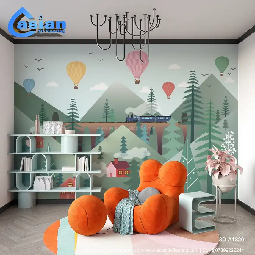 This enchanting wallpaper features a picturesque scene with colorful hot air balloons floating above green mountains, a steam train chugging along a scenic track, and quaint houses dotting the hillsides. The soft pastel background creates a dreamy atmosphere perfect for inspiring adventure and imagination in kids' bedrooms, playrooms, or nurseries. The whimsical design is both calming and fun, making it ideal for a child's creative space. Benefits:- Create a fun and imaginative space for your child with this whimsical wallpaper featuring a steam train, hot air balloons, and beautiful mountains.