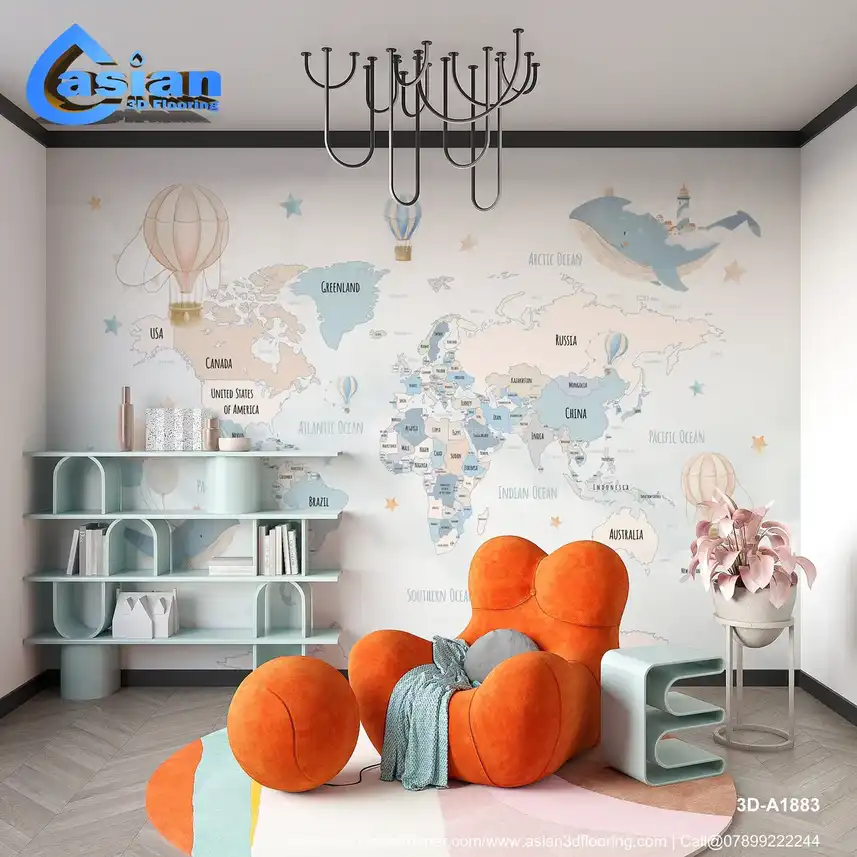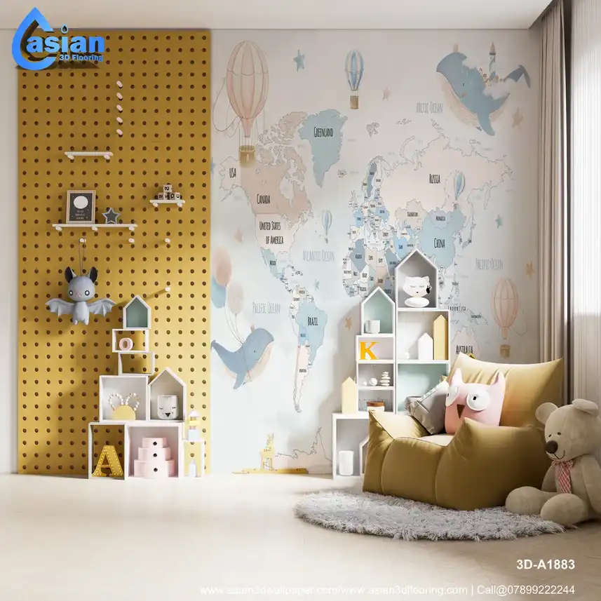 This enchanting world map wall mural is designed to spark imagination and a love for exploration in young minds. Featuring a soft pastel color palette, whimsical hot air balloons, playful whales, and labeled countries and oceans, it's the perfect addition to any child's bedroom, nursery, or playroom. Available as a [Mural Material/Print/Decal]. Shop Asian 3D Wallpaper! Benefits:- Creates a fun and educational focal point in a child's room. Sparks imagination and a sense of adventure. Soft pastel colors create a calming atmosphere. Easy to install [Mural Material/Print/Decal]. Durable and long-lasting.